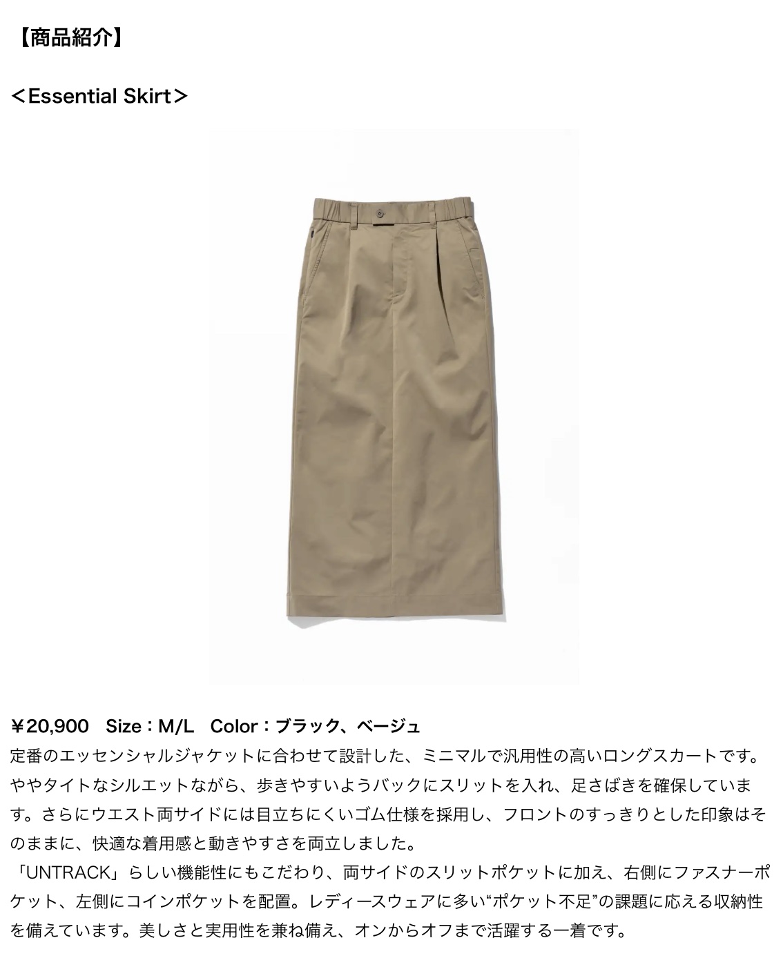 バッグメーカーのエース株式会社(本社:東京都渋谷区)は、バッグとウェアを展開するライフスタイルブランド「UNTRACK」(アントラック)より、ブランド初となるスカートアイテム2種を発売します。