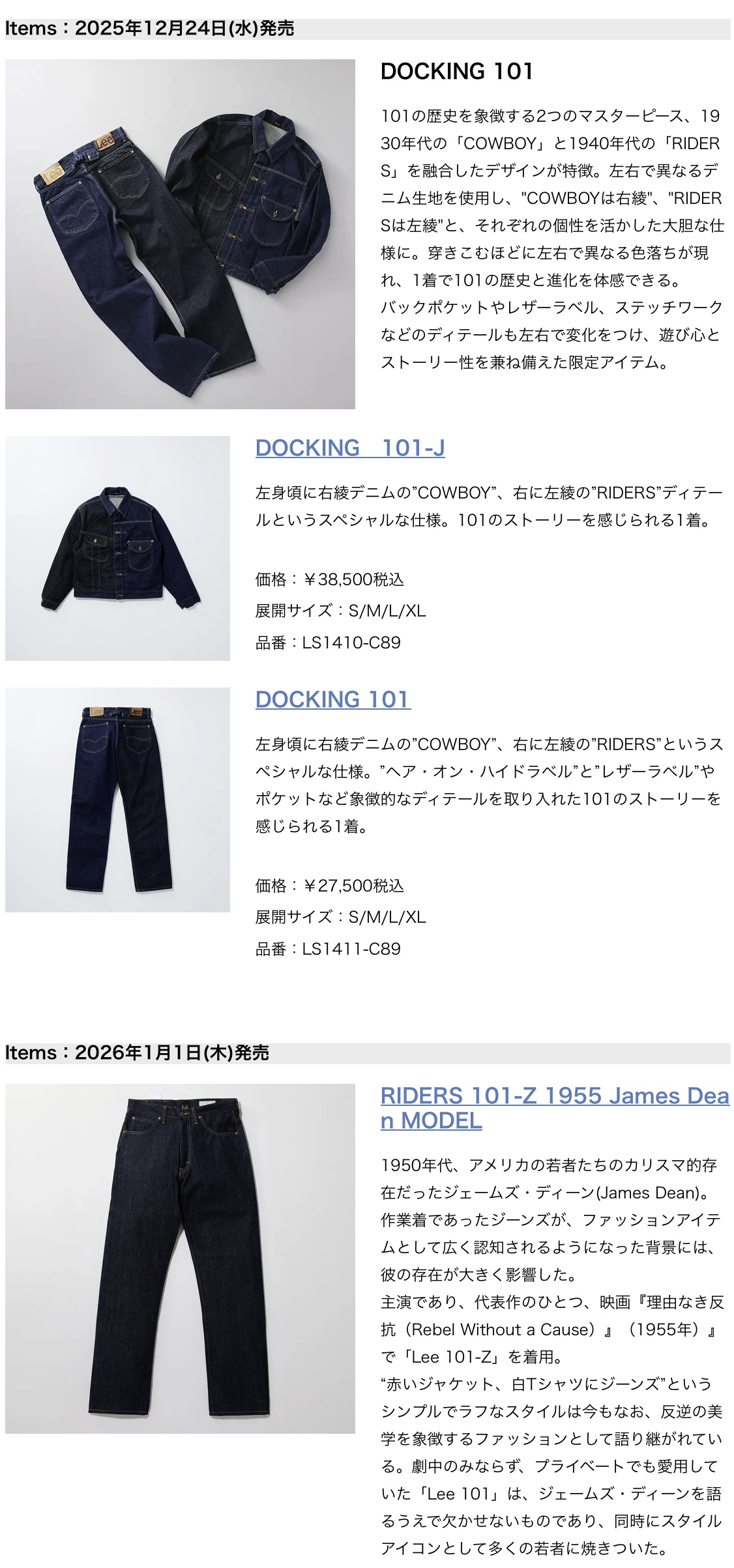 EDWIN 【Lee】年末年始に”101”限定商品を発売。101のレガシーを体感するスペシャルアイテム。 ジェームズ・ディーンモデル復刻&101アニバーサリーモデルをLee SHOP、オンラインで発売。 (2025.12)