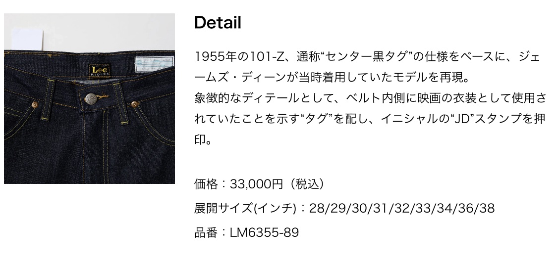 もう一方は、1950年代のアメリカンカルチャーを象徴する俳優ジェームズ・ディーンが劇中・私生活で愛用した「Lee 101-Z 1955」復刻モデルを再販売いたします。