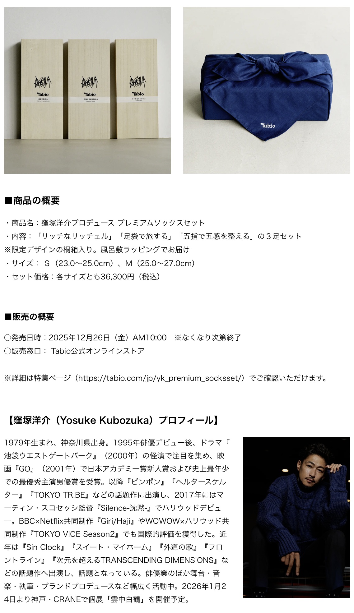 タビオ株式会社 「窪塚洋介プロデュース プレミアムソックスセット」限定100セットを2025年12月26日(金)、Tabio公式オンラインストアで発売 (2025.12)
