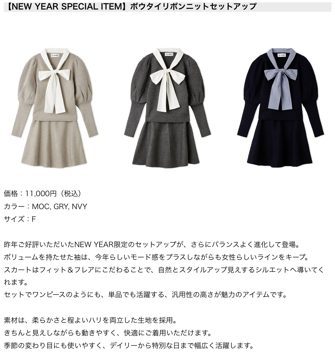 株式会社マッシュホールディングス 【LILY BROWN】日頃の感謝を込め、新年特別企画としてスペシャルなセットアイテムが2型登場!<オンライン:2026年1月1日(木)/店舗:初売日より発売> 昨年即完売したボウタイニットセットアップをアップデート!さらにボンディングスウェットセットアップが新登場し、数量限定で発売 (2025.12)