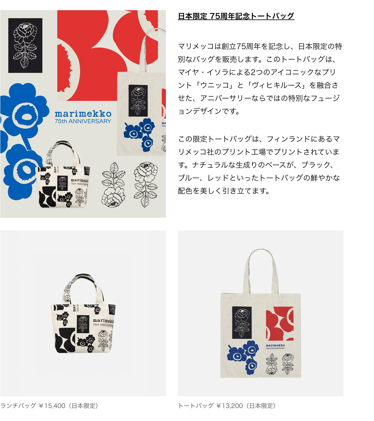 株式会社ルックが展開するフィンランドのデザインハウス マリメッコ(Marimekko)は、ブランド創立75周年を記念し、特別に制作された日本限定のアニバーサリーバッグ2型を販売。新作マリデニムおよびホームコレクションとともに、一般販売に先駆けて、1月16日(金)より日本公式オンラインストアにて先行販売を開始します。