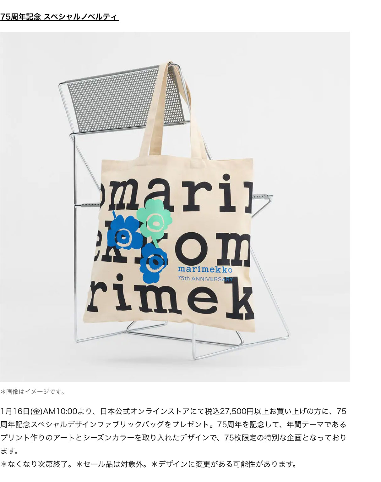 株式会社ルックホールディングス [マリメッコ]ブランド創立75周年を記念した、日本限定のアニバーサリーバッグが登場。新作マリデニム、ホームコレクションと共に公式オンラインストアにて先行販売開始。75枚限定の特別デザインノベルティも。 日本公式オンラインストアにて、2026年1月16日(金)より先行販売開始。 (2026.1)