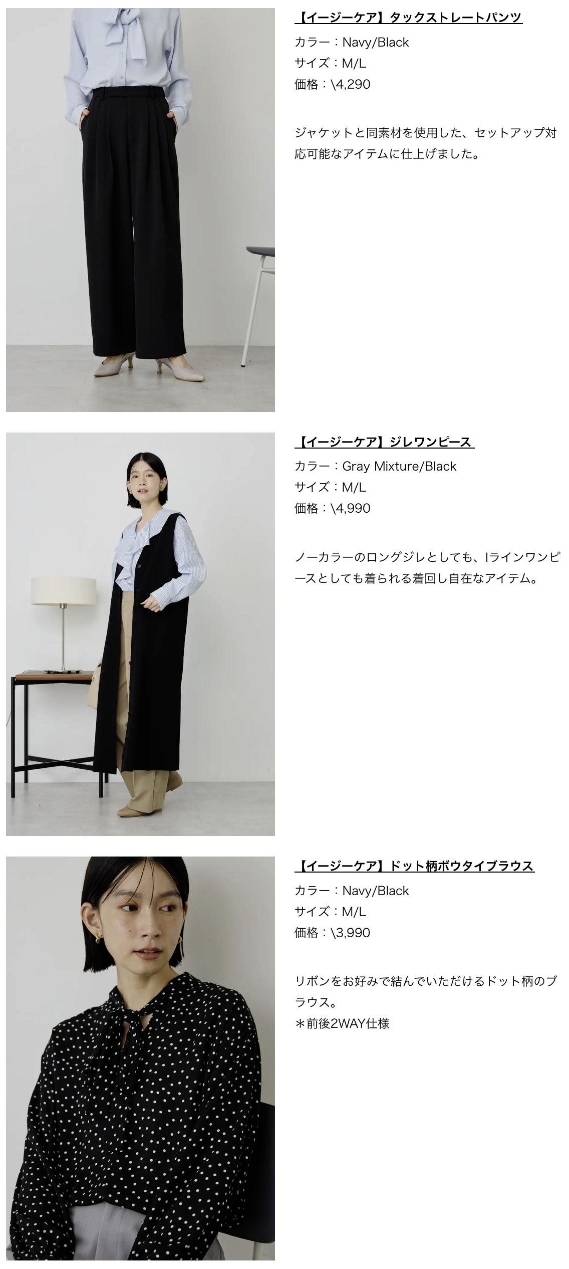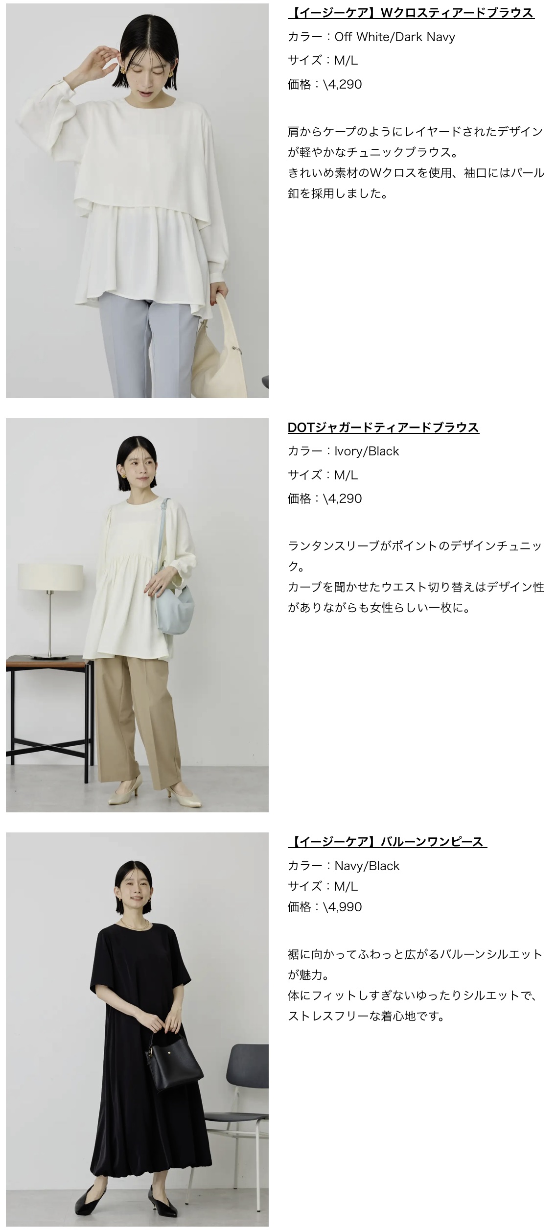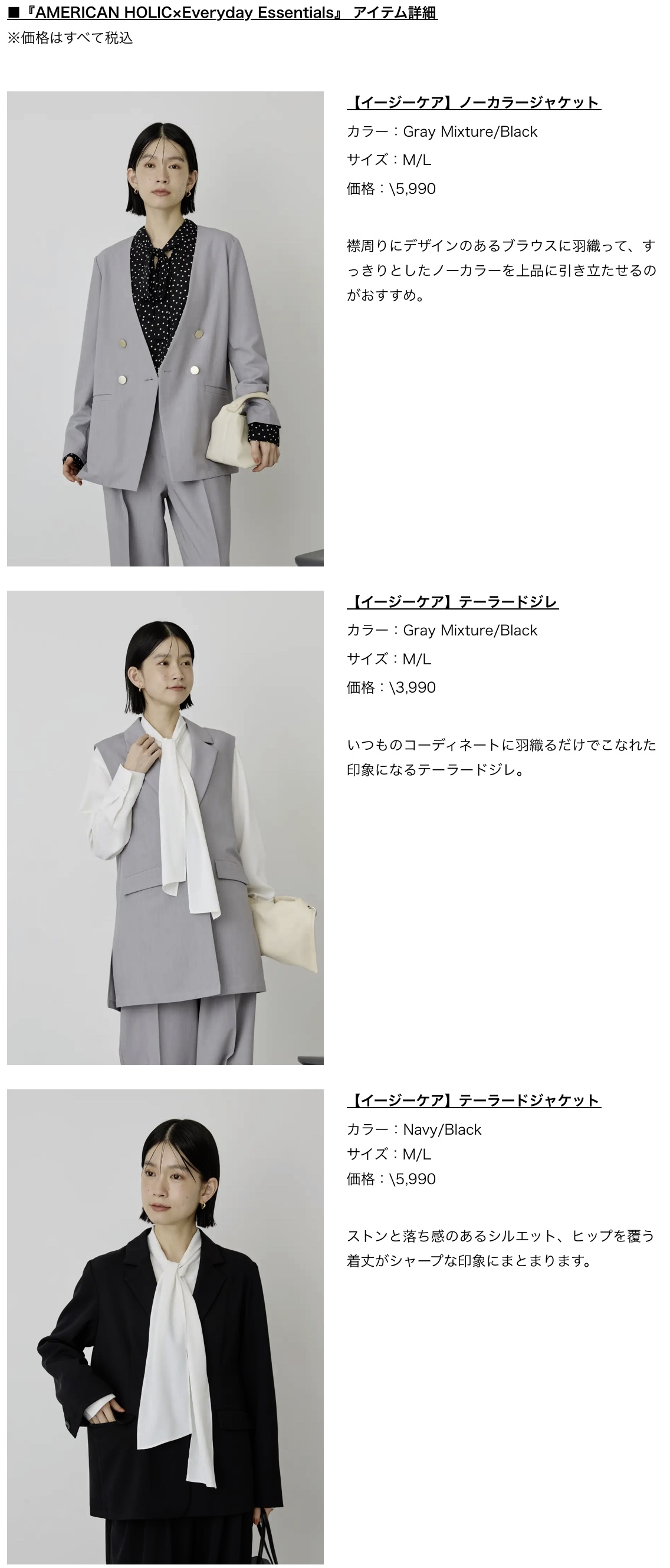 販売アイテム:ジャケット2型、ワンピース3型、ブラウス6型、パンツ、ジレ 全13型