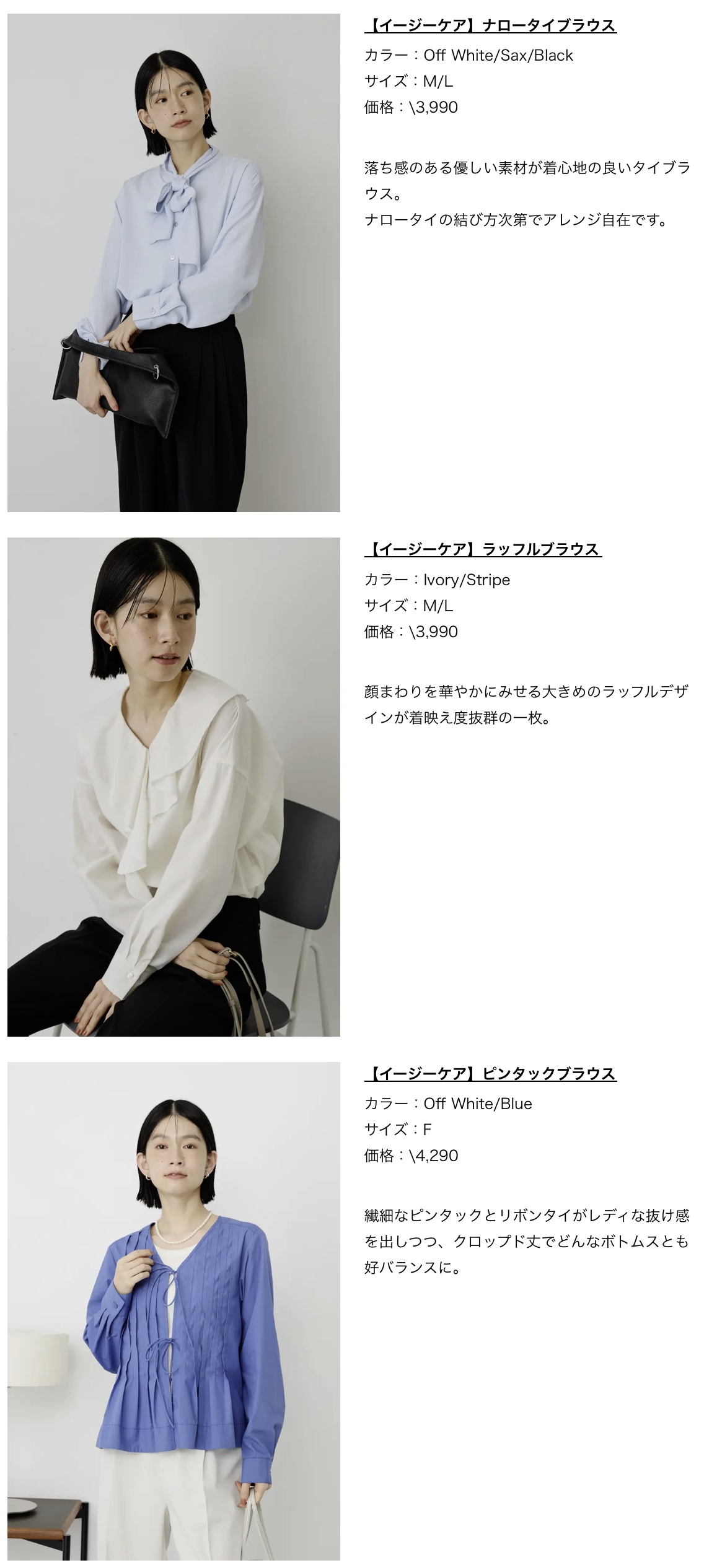 ジャケット合わせだけでなく、1枚でも着映えするブラウスは全6型。ドット柄のボウタイブラウスや上品なタイブラウス、顔まわりを華やかに演出するラッフルブラウスなど、バリエーション豊かに揃えました。