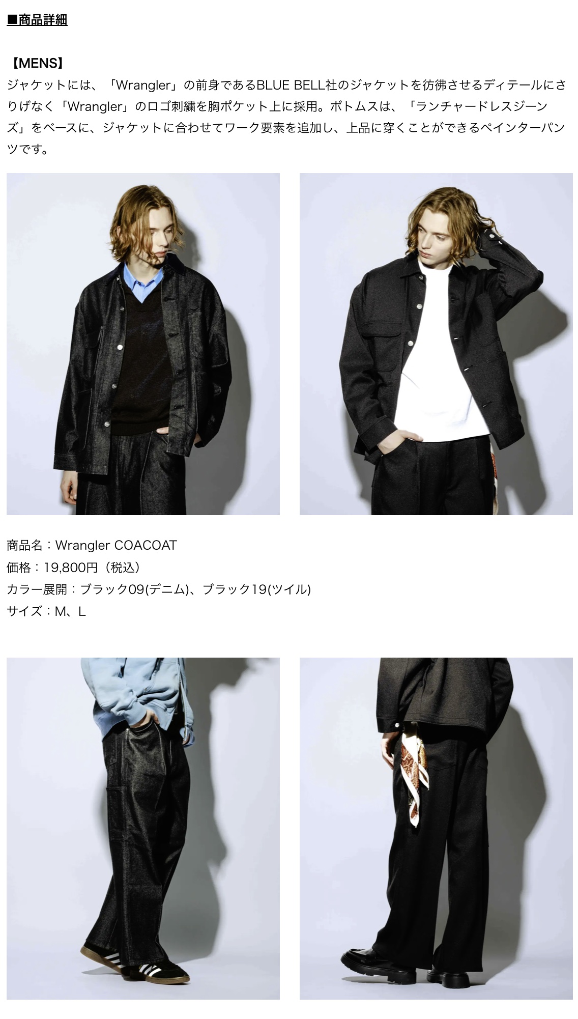 株式会社アンドエスティHD 「RAGEBLUE」から、歴史のある人気ジーンズブランド「Wrangler」との別注コレクションが登場!メンズとレディース共に、品よく着こなせるセットアップ全4型を1月16日(金)より発売 名品の「ランチャードレスジーンズ」をリスペクトした、ジャケットとパンツをモダンに昇華 (2026.1)