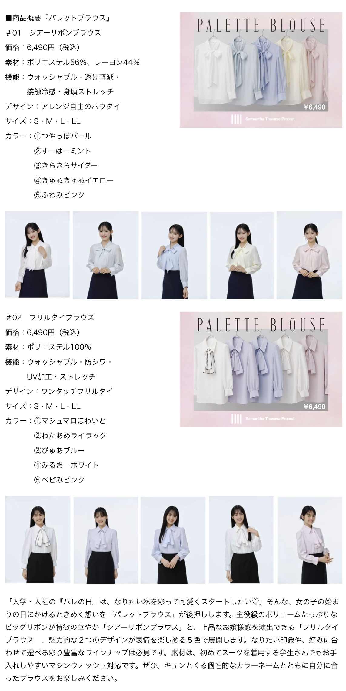 株式会社コナカ(本社:神奈川県横浜市、代表取締役社長CEO:湖中謙介)がリアルスーツをコンセプトに展開している「SUIT SELECT(スーツセレクト)」は、株式会社サマンサタバサジャパンリミテッド(本社:東京都港区、代表取締役社長:古屋幸二)とのコラボプロジェクト、『SUIT SELECT × Samantha Thavasa』より、入学シーンにぴったりな、なりたい私を彩る「パレットブラウス」を、2026年1月17日(土)より 「SUIT SELECT(スーツセレクト)」の全店舗で発売します。今シーズンは、「多田梨音さん」「竹下優名さん」をイメージキャラクターとして迎え、おふたりが、華やかかつ上品に、学生のみなさんの始まりの日をファッションから応援します。