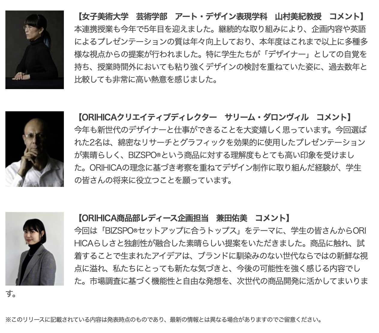 株式会社AOKI(代表取締役社長:青木彰宏)が展開する『ORIHICA』は、経営理念の1つである「公共性の追求」という考えのもと、女子美術大学の学生デザイナーとフレックスジャパン株式会社とともに、日本のファッション業界を担う有望な若手デザイナーの育成支援を目的とした産学協働プロジェクトを2022年より実施しております。前回に続き、第5弾となる今回もレディースのトップスを企画。2025年秋に大人気商品「BIZSPO®」からレディースセットアップを発売し、本商品に合うトップスをテーマに2人の学生によるアイデアを商品化いたします。2026年4月より、ORIHICAの公式オンラインショップにて販売予定です。