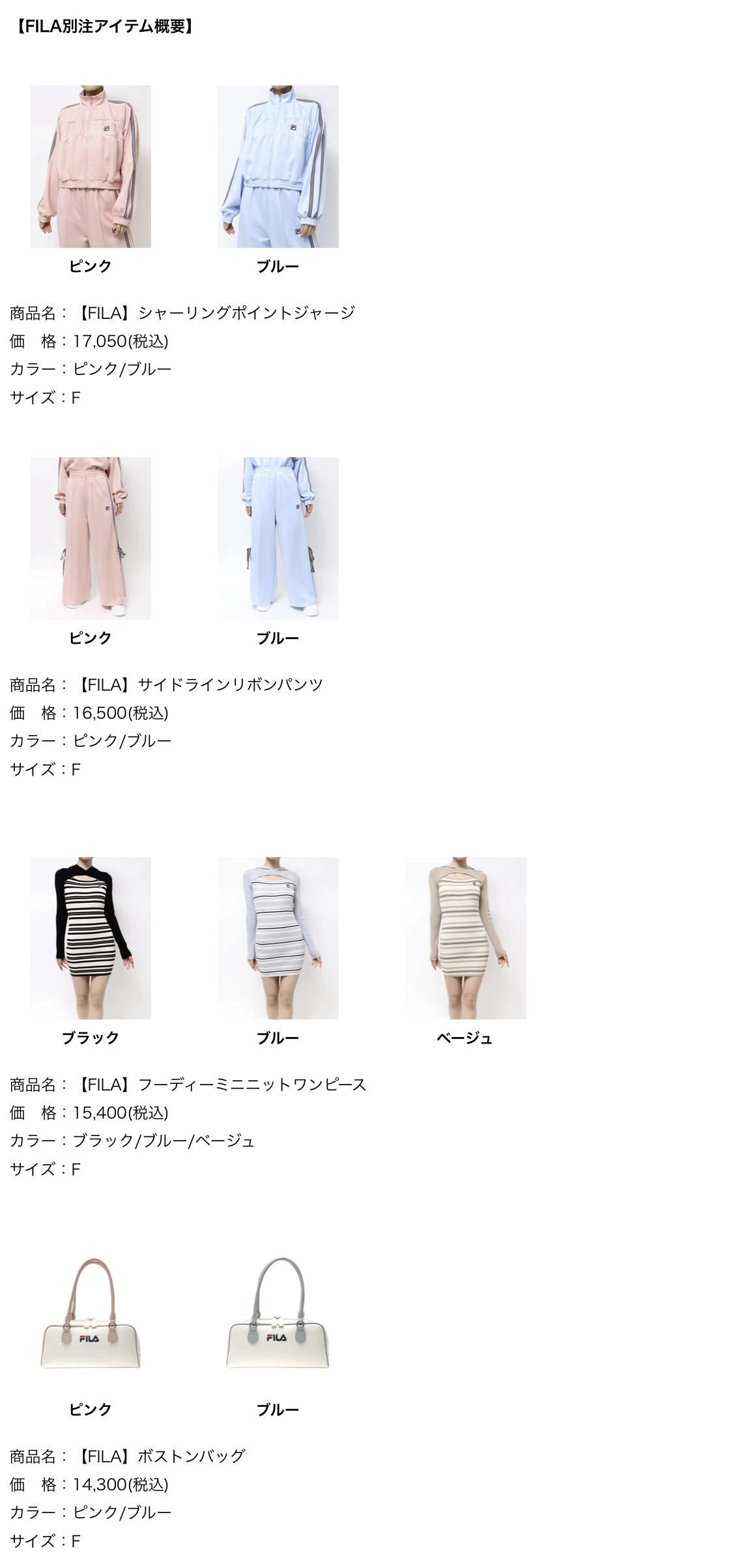 柔らかなペールトーンのジャージとサイドリボンを施したパンツ、スポーティなフード付きボーダーミニワンピース、トレンドのボストンバッグ計4型を展開します。