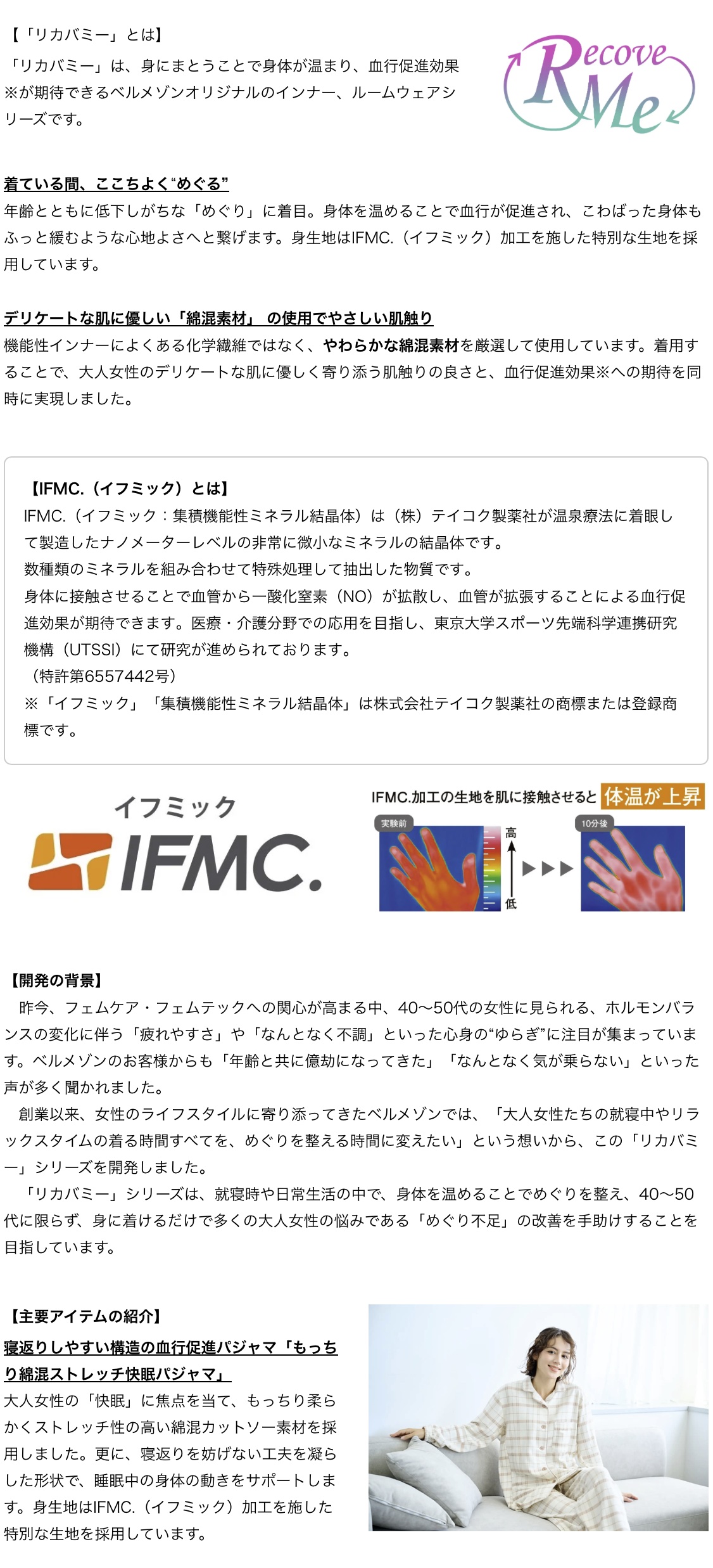 株式会社千趣会(本社:大阪市 代表取締役社長:鈴木聡 以下千趣会)の通販事業ベルメゾンは、40~50代を中心とする大人女性に向けた“着るだけ血行促進※ウェア”「リカバミー」シリーズを新たに展開します。パジャマ、ナイトブラ、ショーツ、インナー、Tシャツの計5点を2026年1月26日(月)よりベルメゾンネットにて販売開始します。( https://www.bellemaison.jp/ )