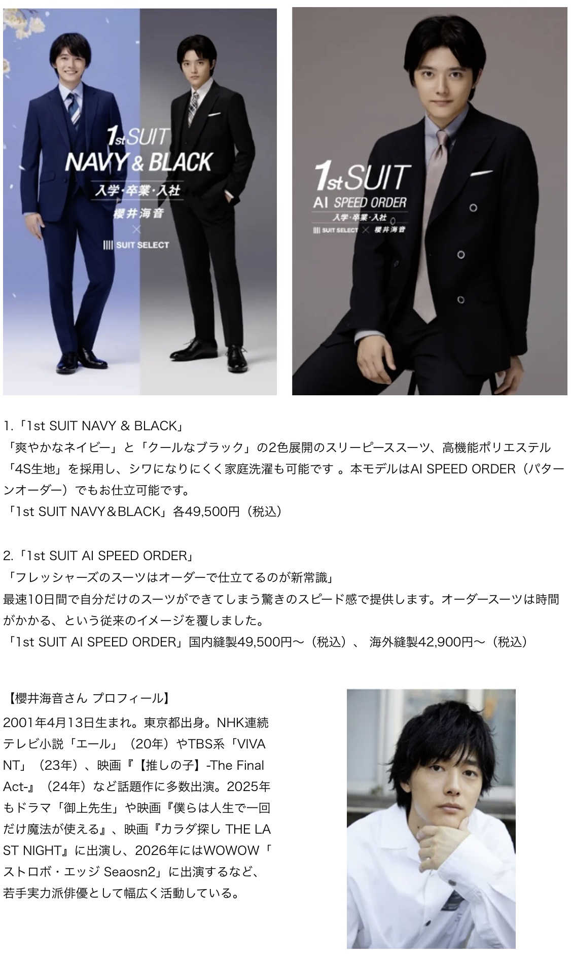 コナカ 2026年フレッシャーズ『SUIT SELECT × 櫻井海音』ハレの日にふさわしい、今どきスタイル「WIDE PANTS SUIT」で自分らしい門出を! (2026.1)