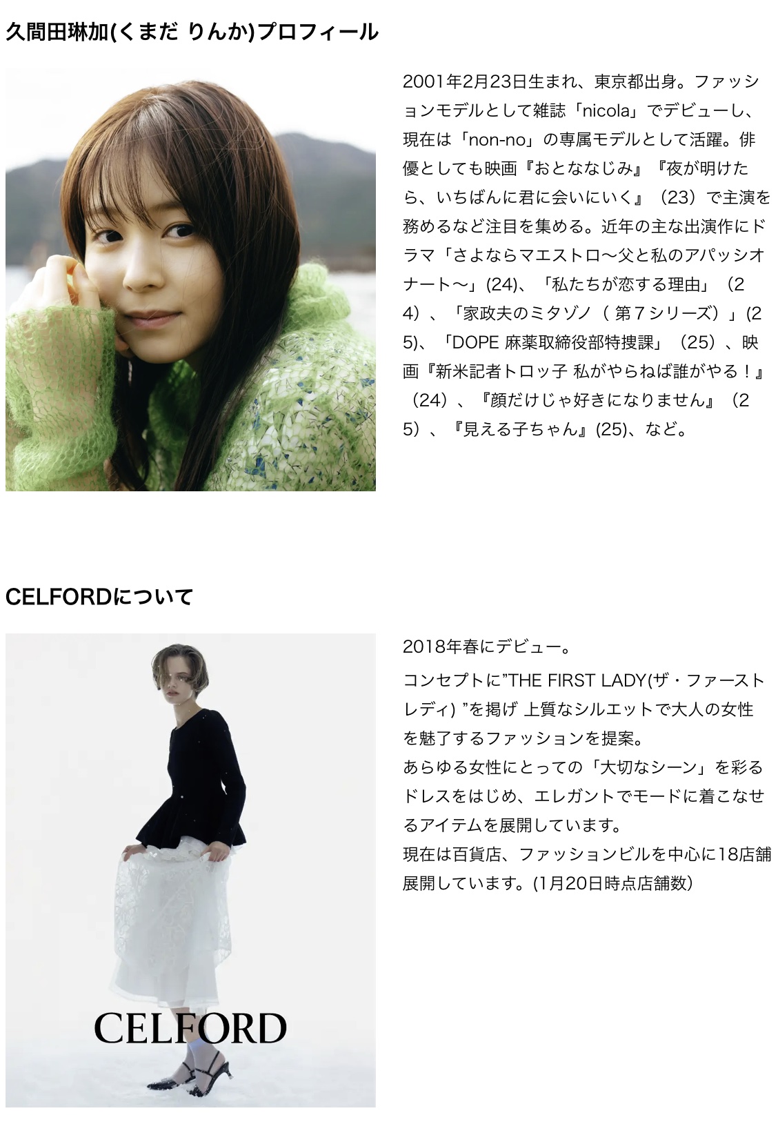 株式会社マッシュホールディングス 【CELFORD(セルフォード)】久間田琳加が着こなす「Beyond the Feel」をテーマにした2026年最新の春コレクション! 日常を特別な瞬間へと変えていく、春のコレクションが登場 (2026.1)
