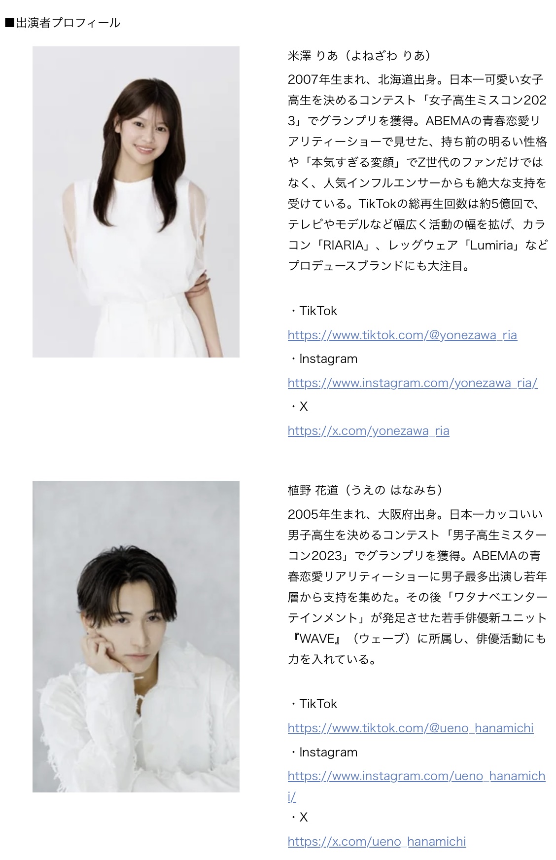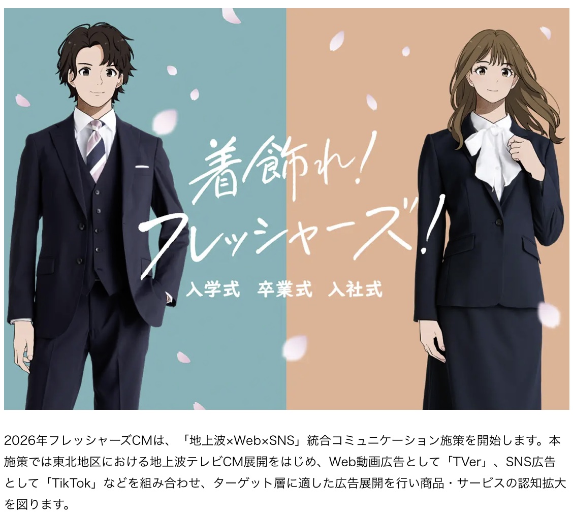 このような背景から安心して“最初の一着!”をお選びいただけるようにフレッシャーズと同世代であり、等身大の自分がイメージできる「米澤りあ」さんと「植野花道」さんを2026年フレッシャーズCMに起用することとなりました。今回のCMではフレッシュな笑顔でワクワク感が伝わるスーツ選びを演じていただいています。