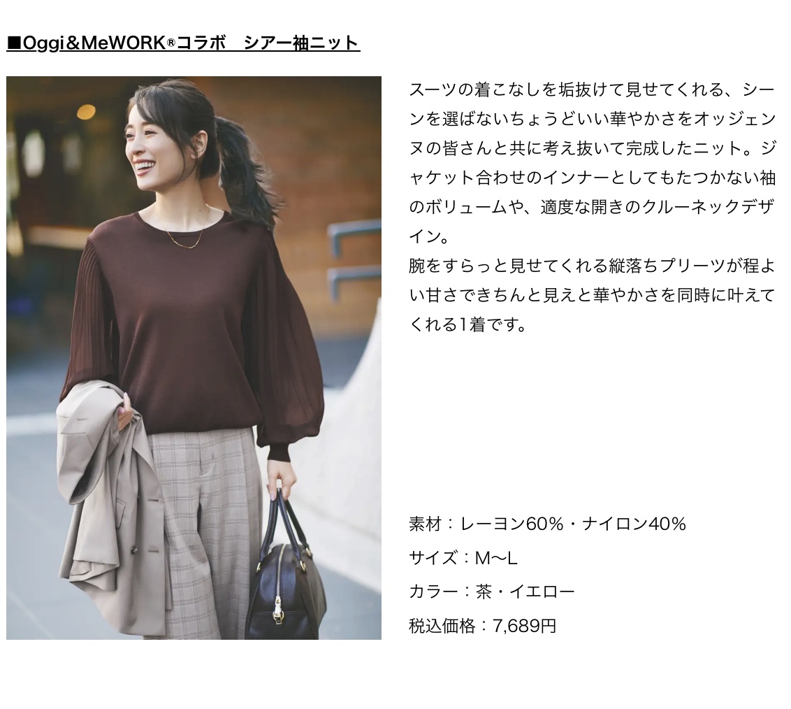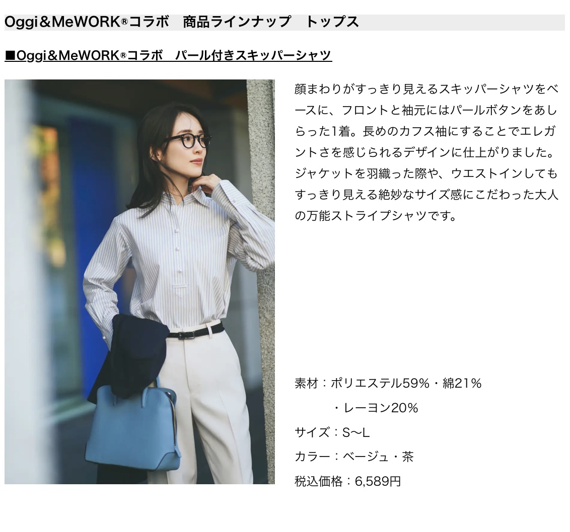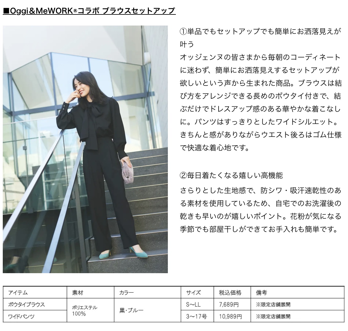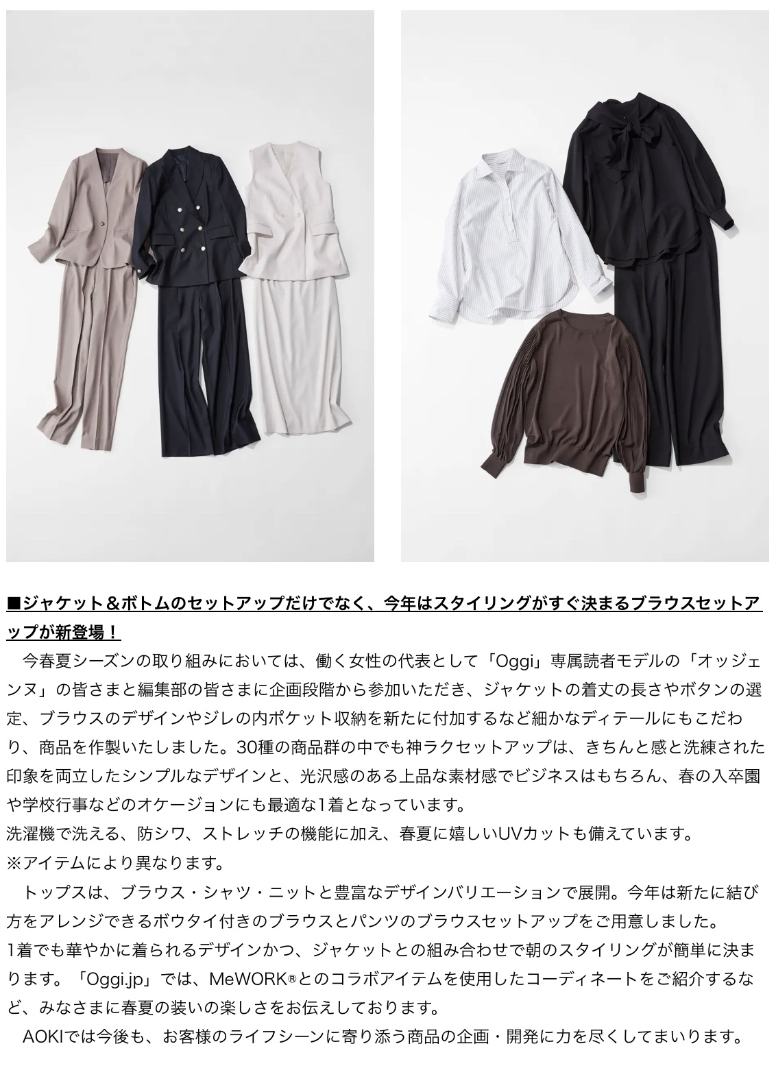 株式会社AOKI(代表取締役社長:青木彰宏)は、この度女性ファッション誌「Oggi」(小学館発行)とコラボレーションした全30アイテムの販売を開始しました。今回、「Oggi」の専属読者モデル「オッジェンヌ」の皆さまと、「Oggi」編集部にご協力いただき、働く女性のリアルな声を反映したセットアップ・トップスを開発。MeWORK®の強みである高機能性に加え、長めの着丈やボタンデザイン、ポケット収納など細かな部分にもこだわり商品化いたしました。