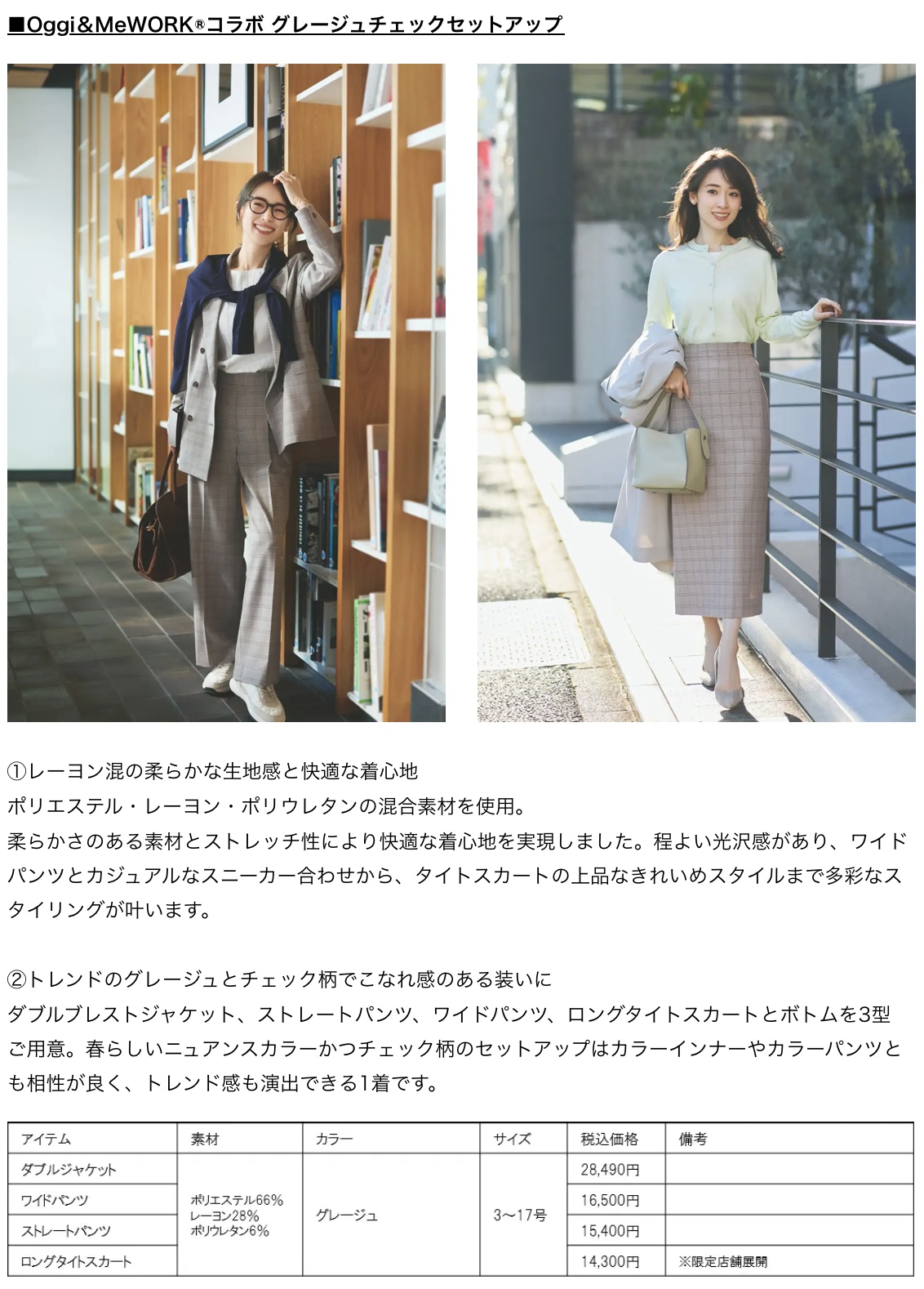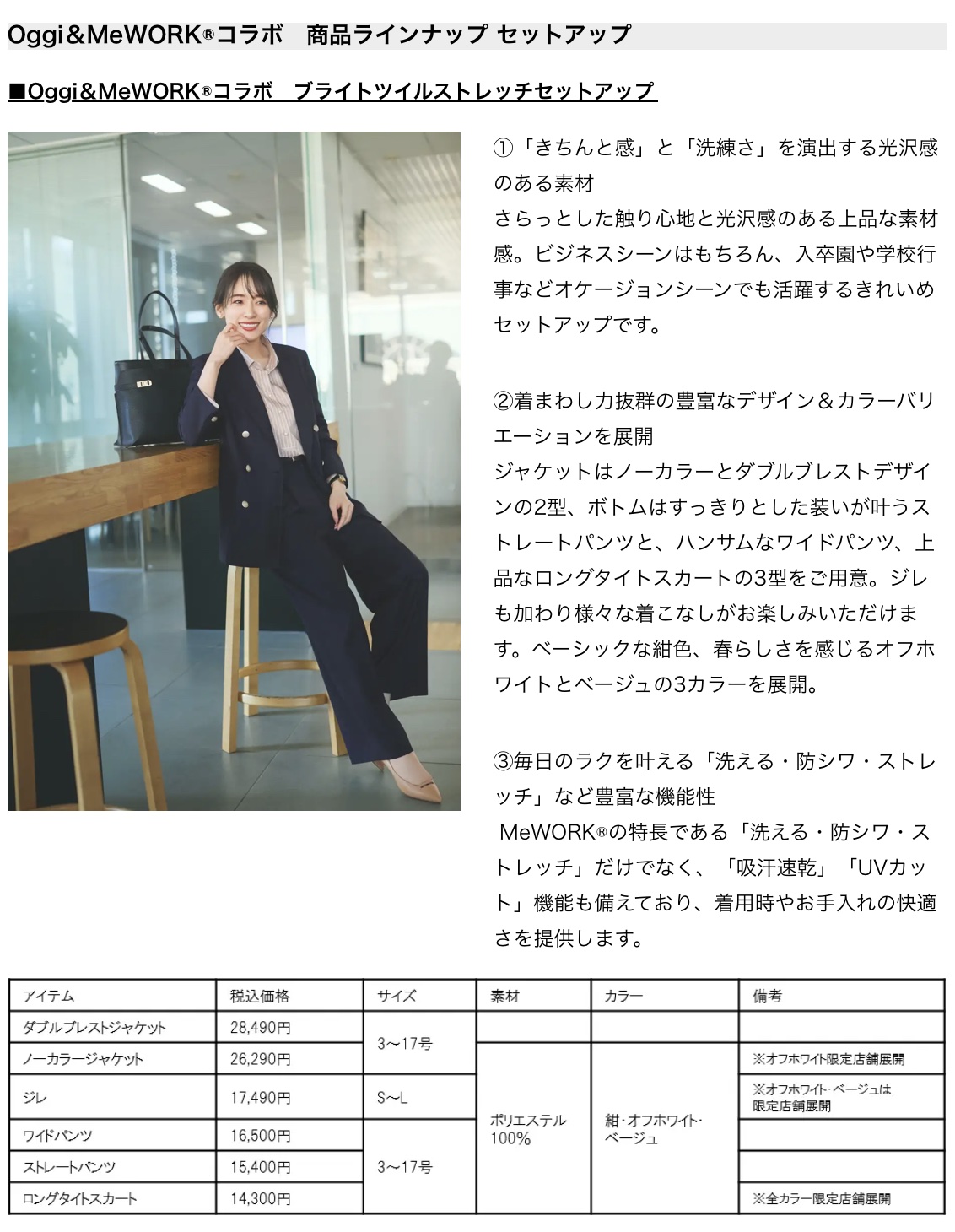 株式会社AOKI 人気雑誌「Oggi」とMeWORK®のコラボアイテムが新登場高機能とトレンドを両立したセットアップ・トップスなど全30種! 〜ポケット収納などリアルな声を反映し仕事からオケージョンまで使える汎用性〜 (2026.1)