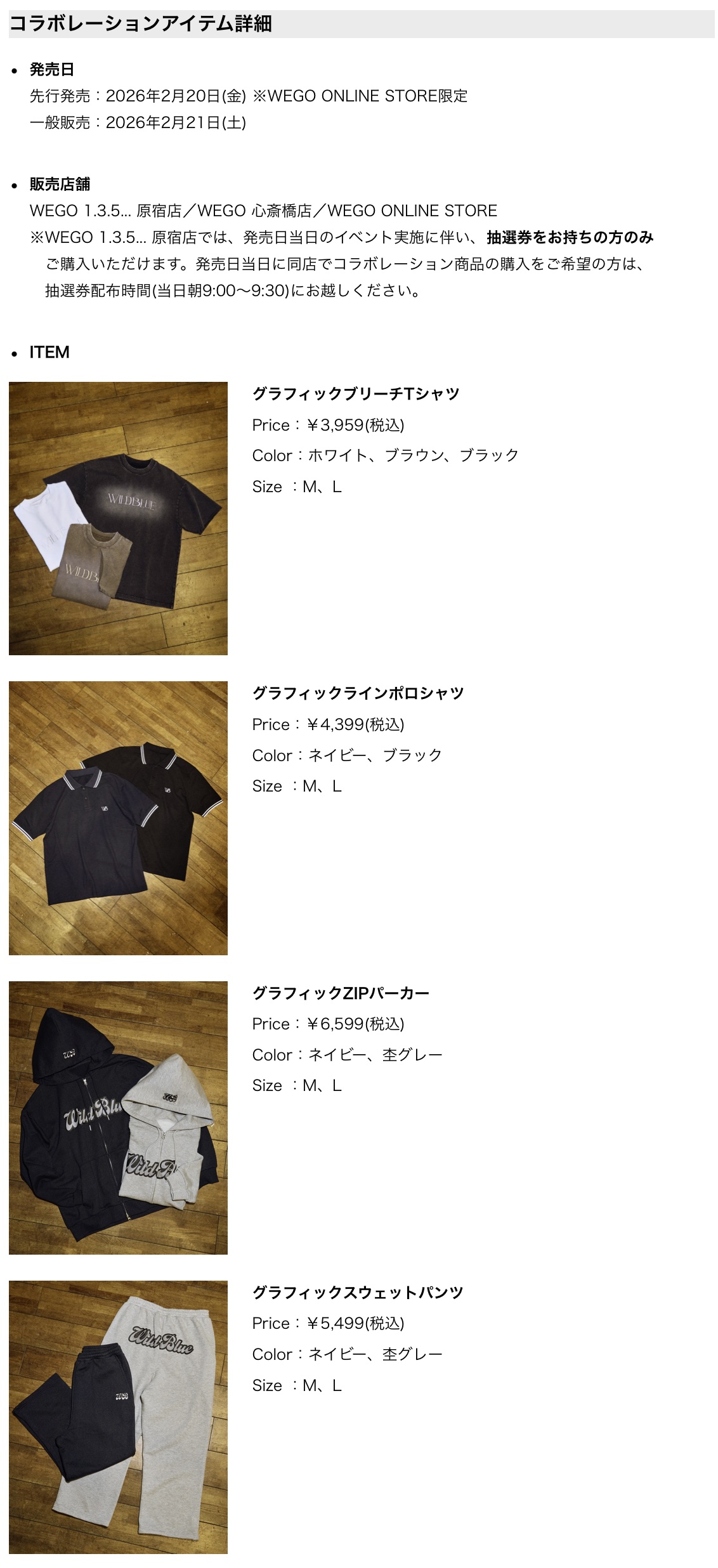 株式会社ウィゴー(本社:東京都港区 代表取締役社長:園田恭輔)が展開するLifestyle Culture StoreのWEGOは、昨年デビュー1周年を迎えた5人組ボーイズグループ「WILD BLUE(ワイルドブルー)」とのコラボレーションアイテムを、2026年2月20日(金)にWEGO ONLINE STOREにて先行発売、2026年2月21日(土)にWEGO 1.3.5...原宿店およびWEGO 心斎橋店にて発売いたします。