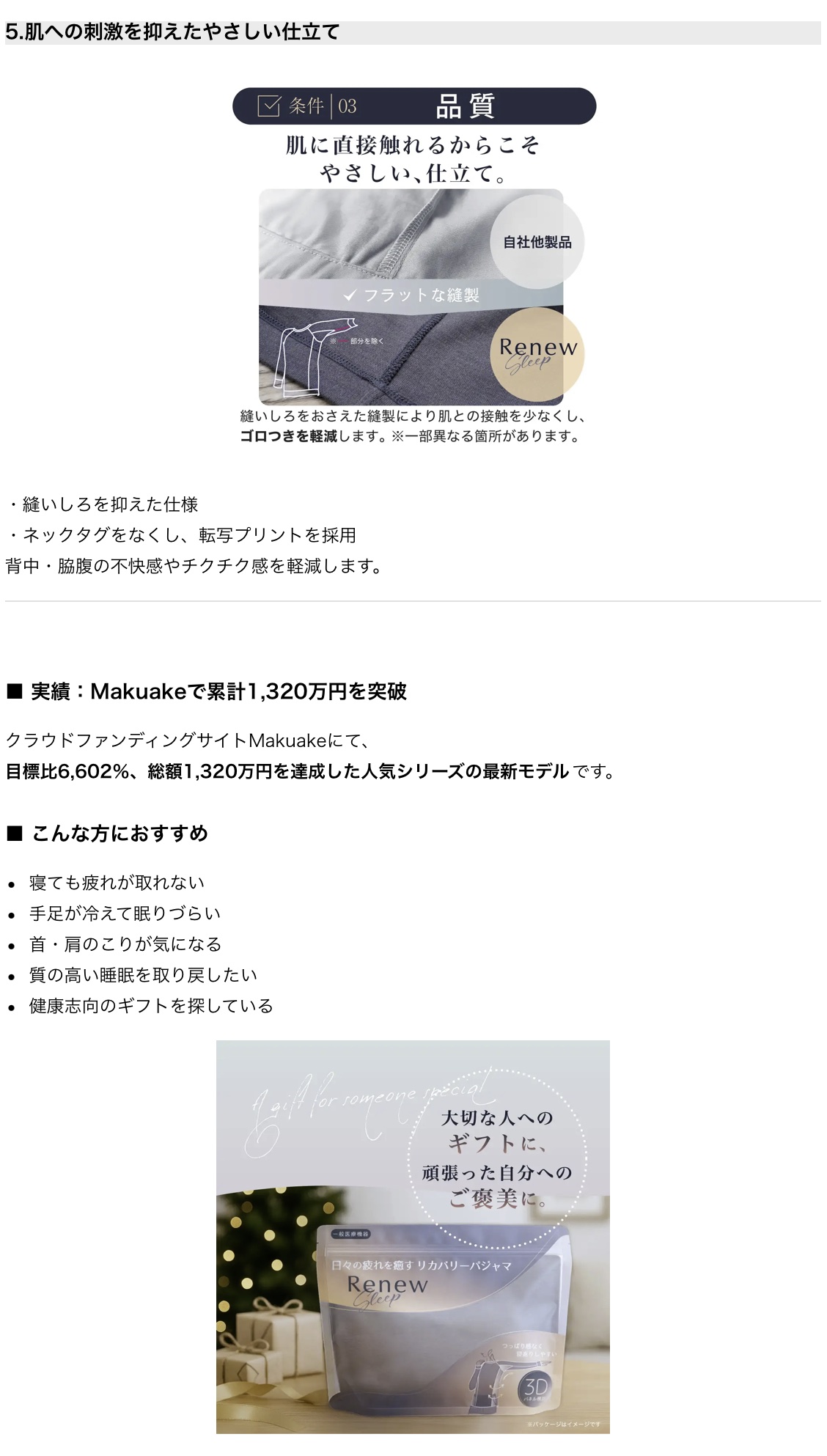 株式会社ロマンス小杉 一般販売開始!Makuakeで1,320万円を突破した“疲労回復パジャマ”『Renew Sleep』がついに発売 寝具メーカー・ロマンス小杉は、「Makuake」で目標比6,602%を達成したリカバリーパジャマ『Renew Sleep(リニュー スリープ)』の一般販売を開始しました。 (2026.1)