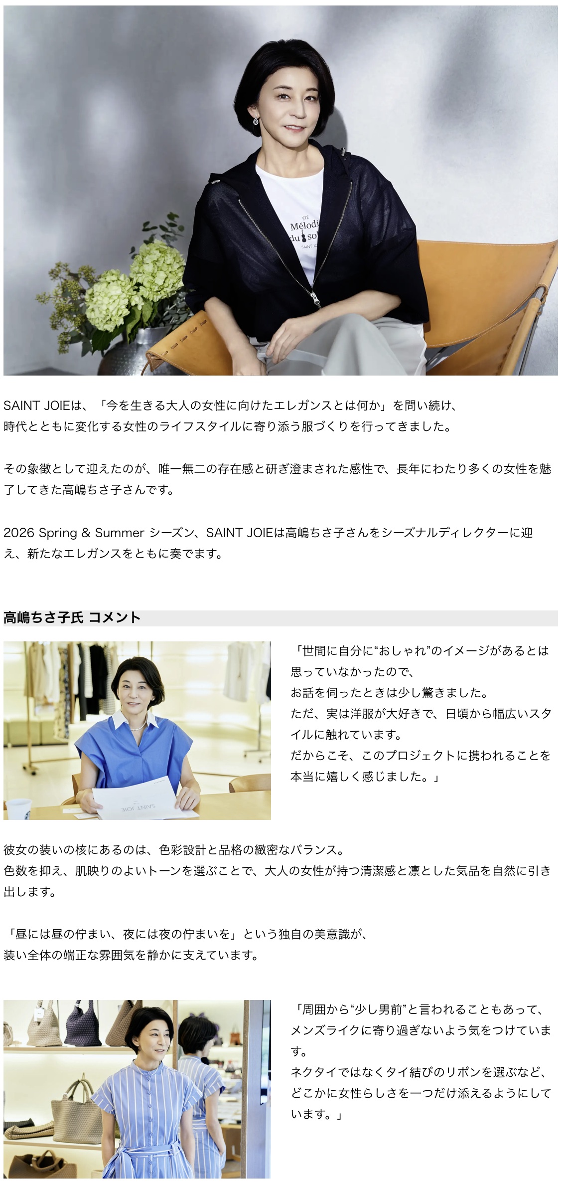 株式会社クイーポ(本社:東京都新宿区)が展開するレディースブランド「SAINT JOIE(サンジョア)」は、2026 Spring & Summer シーズン、ヴァイオリニスト・高嶋ちさ子氏をシーズナルディレクターに迎え、新たなコレクションを発表いたします。