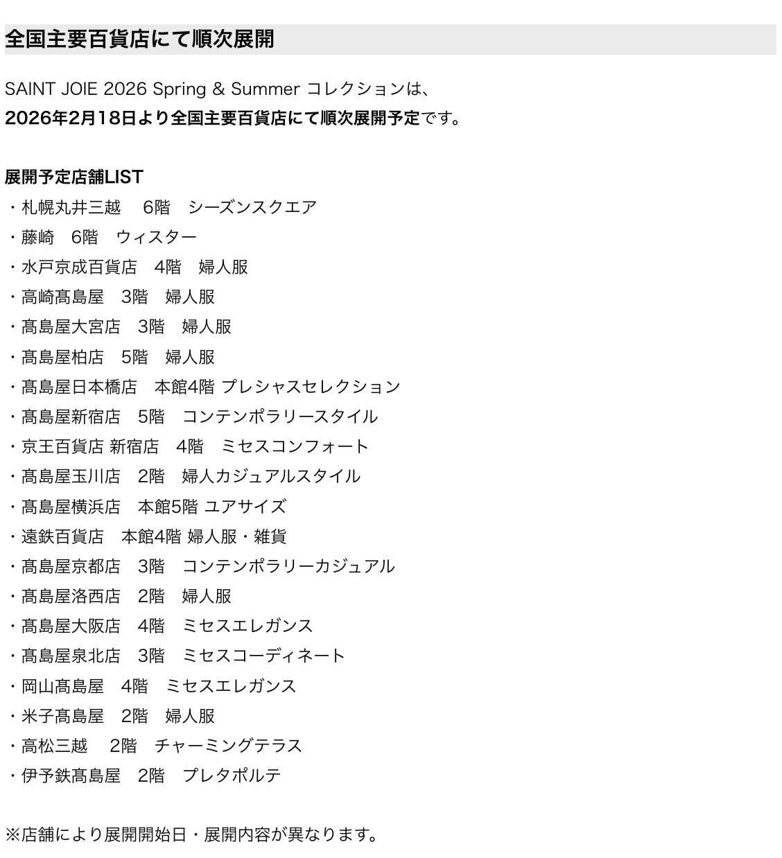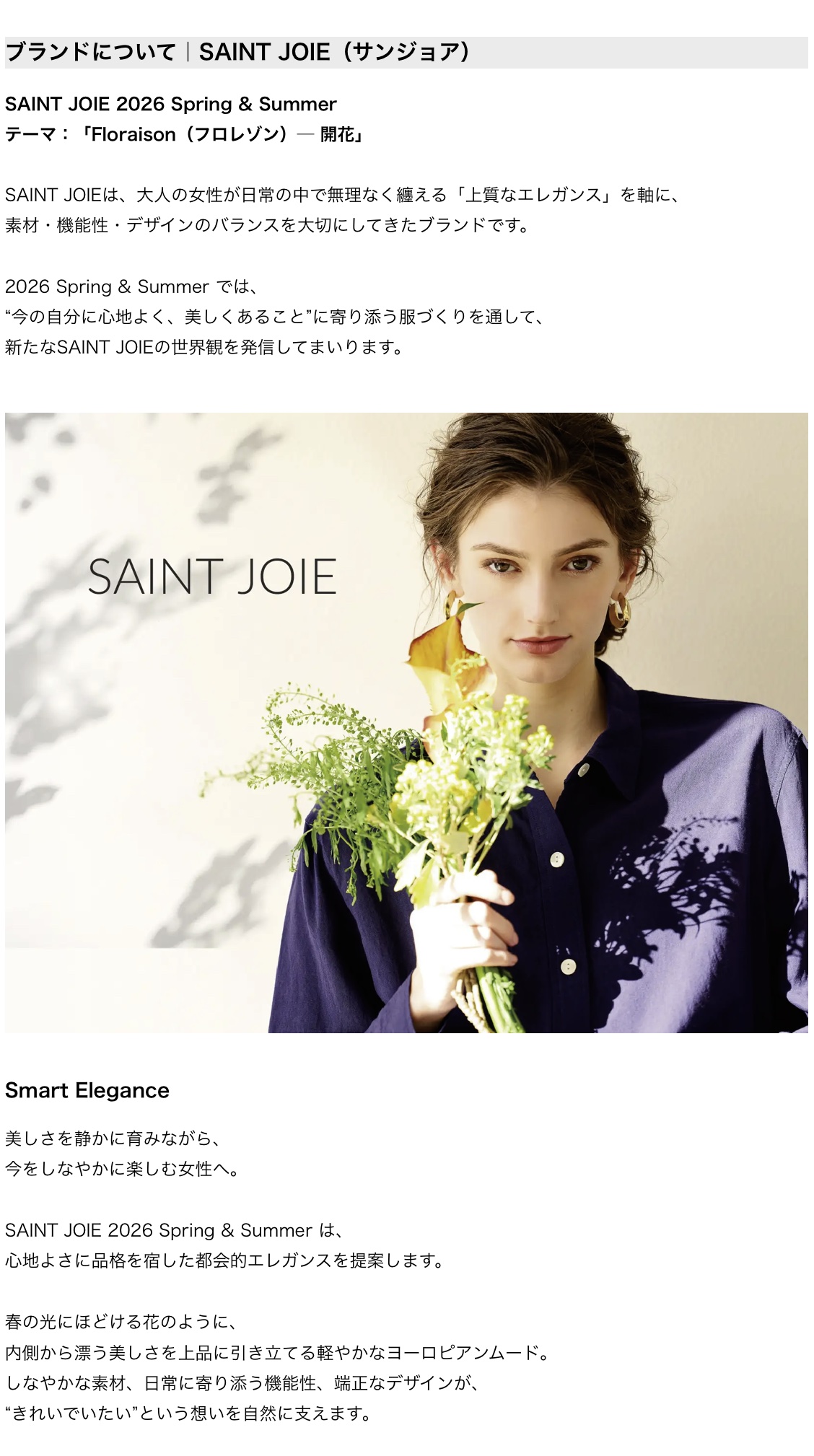 株式会社クイーポ 高嶋ちさ子氏がシーズナルディレクターに就任 SAINT JOIE(サンジョア)、2026SSコレクション発表 シーズンテーマは「Floraison(フロレゾン)」。内側から花開く美しさを描く「Smart Elegance」を提案。全国主要百貨店にて2026年2月18日より順次展開。 (2026.1)