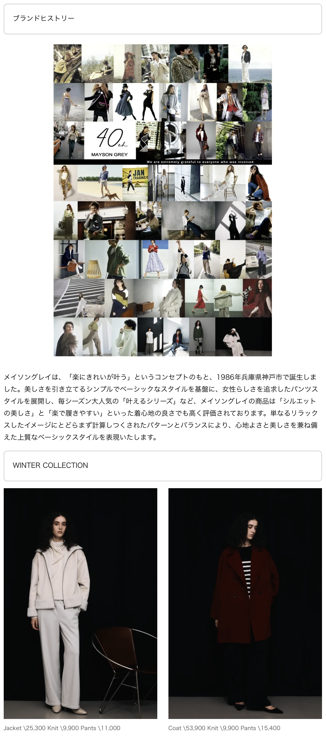 株式会社ジャヴァコーポレーション(神戸市中央区/代表取締役社長 浅見 幸正)が運営するレディースブランド「MAYSON GREY(メイソングレイ)」は、ブランド創立から40周年を迎えました。これまでのご愛顧に感謝を込めて、アニバーサリーイヤーとして周年記念アイテムやイベントなど約一年間にわたり特別な企画を展開いたします。