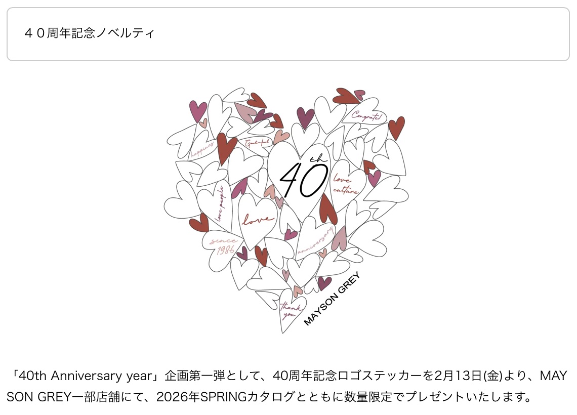 株式会社ジャヴァコーポレーション 【MAYSON GREY(メイソングレイ)40th Anniversary】 ブランド創立40周年の特別な時を迎えて。 アニバーサリーキャンペーン第一弾として「40周年記念ロゴステッカー」をご用意いたしました。 (2026.1)