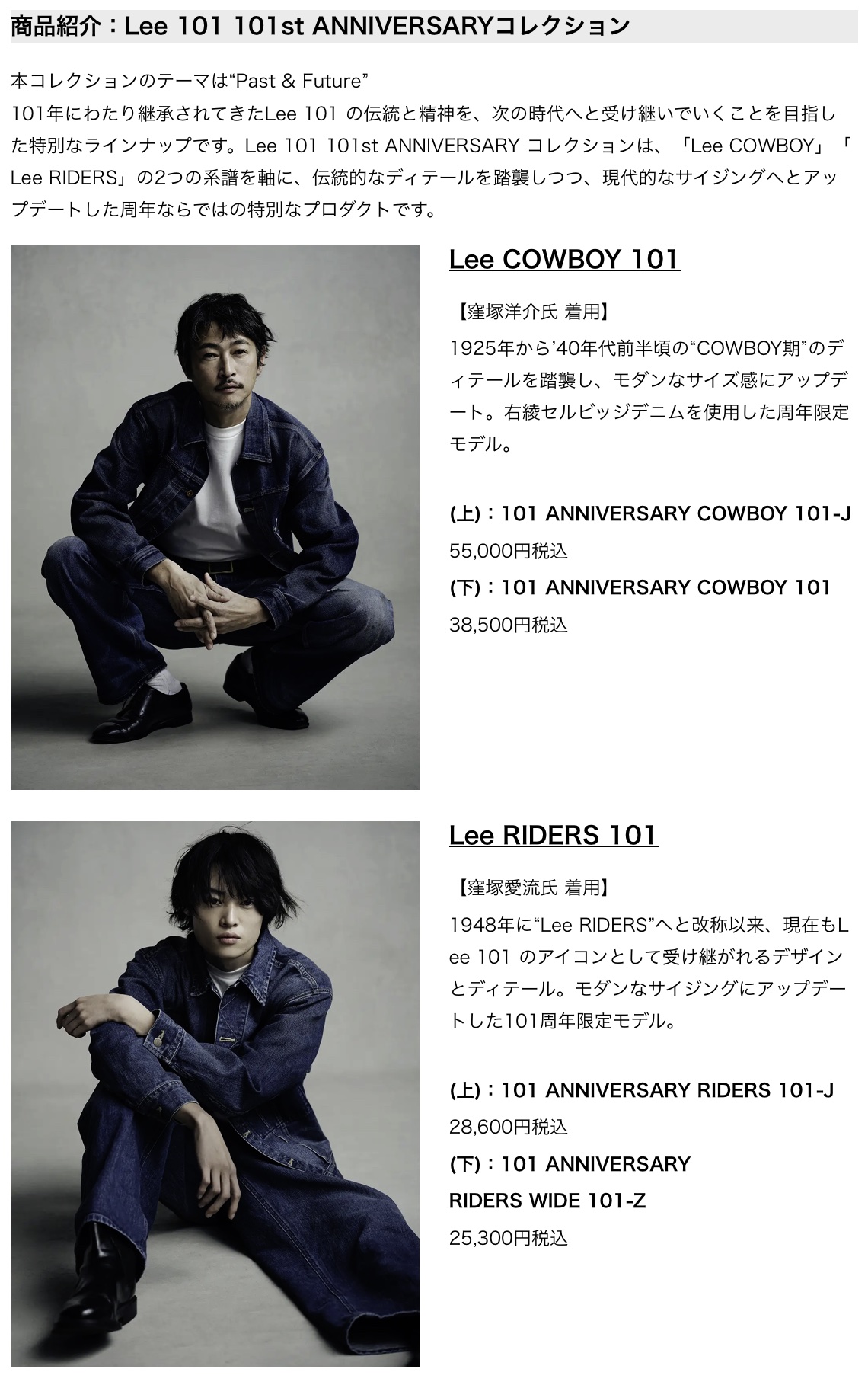 EDWIN 【Lee】名品「Lee 101」が誕生”101”周年。アンバサダーに窪塚洋介・愛流 を親子揃い踏みで起用。伝統と革新が融合した101周年限定モデルを纏う。 101周年を記念した、Lee 101 101st ANNIVERSARY コレクションを発売。「Lee COWBOY」「Lee RIDERS」2つの系譜をモダンにアップデート。 (2026.2)