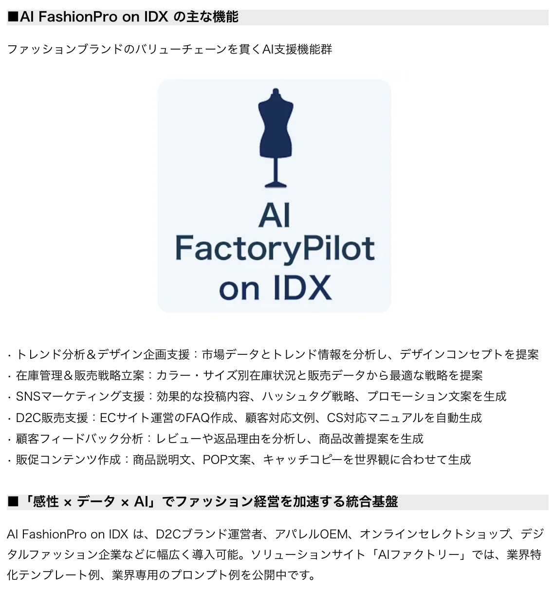 AIデータ株式会社 “ファッションブランド運営に、生成AIの力を ”AIファクトリー「AI FashionPro on IDX」リリース 〜 企画・製造・在庫・SNS・顧客対応まで、D2C時代のファッションDXを支援 〜 (2026.2)