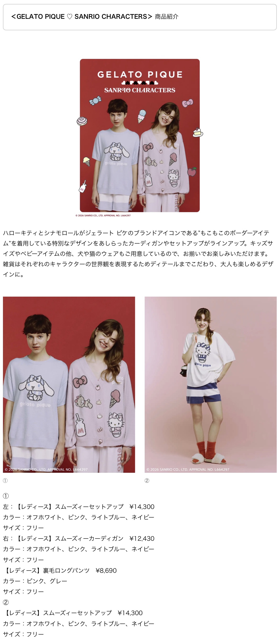 株式会社マッシュホールディングス 【gelato pique(ジェラート ピケ)】初コラボレーションの「GELATO PIQUE ♡ SANRIO CHARACTERS」!リミテッドコンセプトストア対象4店舗にて3月11日(水)発売! ブランド初となるサンリオキャラクターとのスペシャルなコレクションが登場!ジェラート ピケのブランドアイコン”もこもこのボーダーアイテム”をハローキティとシナモロールが着用している特別なデザインに注目! (2026.2)