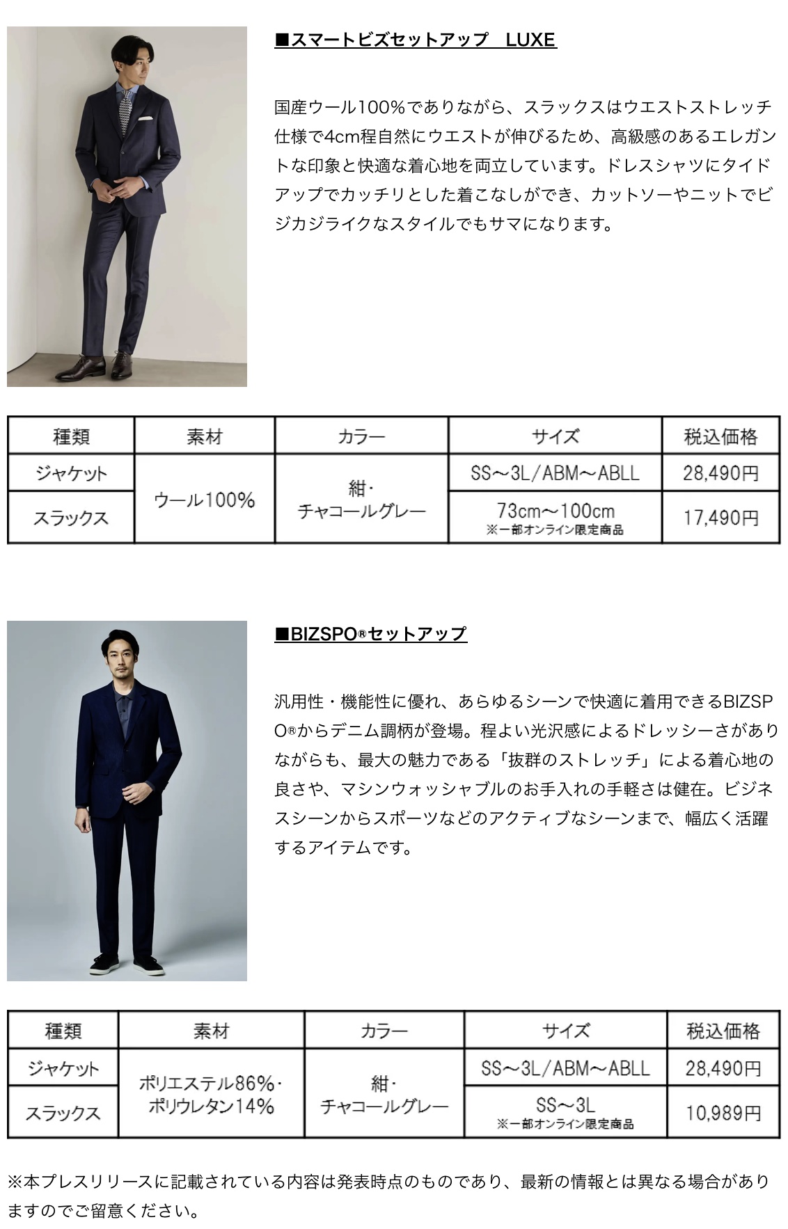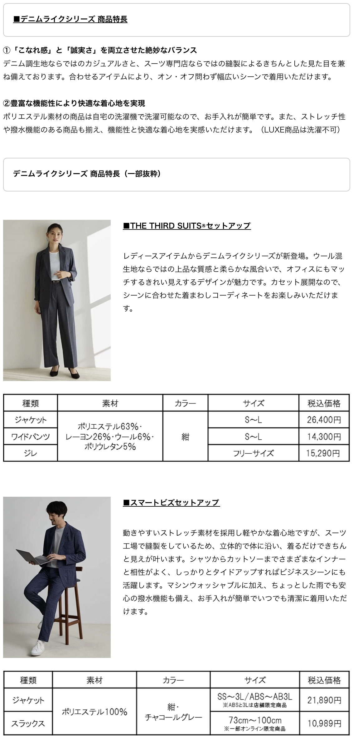 今季よりデニムライクシリーズからレディースアイテムが新登場。メンズアイテムでは機能性の高さが魅力の「スマートビズセットアップ」と 「BIZSPO®」 、高級感溢れる「LUXE」にてバリエーションを拡充いたしました。