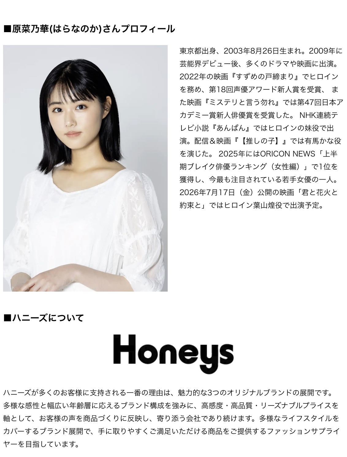 株式会社ハニーズホールディングス(本社所在地:福島県いわき市、代表取締役社長:江尻英介)が展開するレディースブランドHoneys(ハニーズ)は、俳優・原菜乃華(はらなのか)さんとのカラーコラボレーションアイテムを、全国の店舗にて発売およびハニーズ公式オンラインショップにて発売いたしました。あわせて、2026年2月10日(火)より特設ページを公開いたしました。