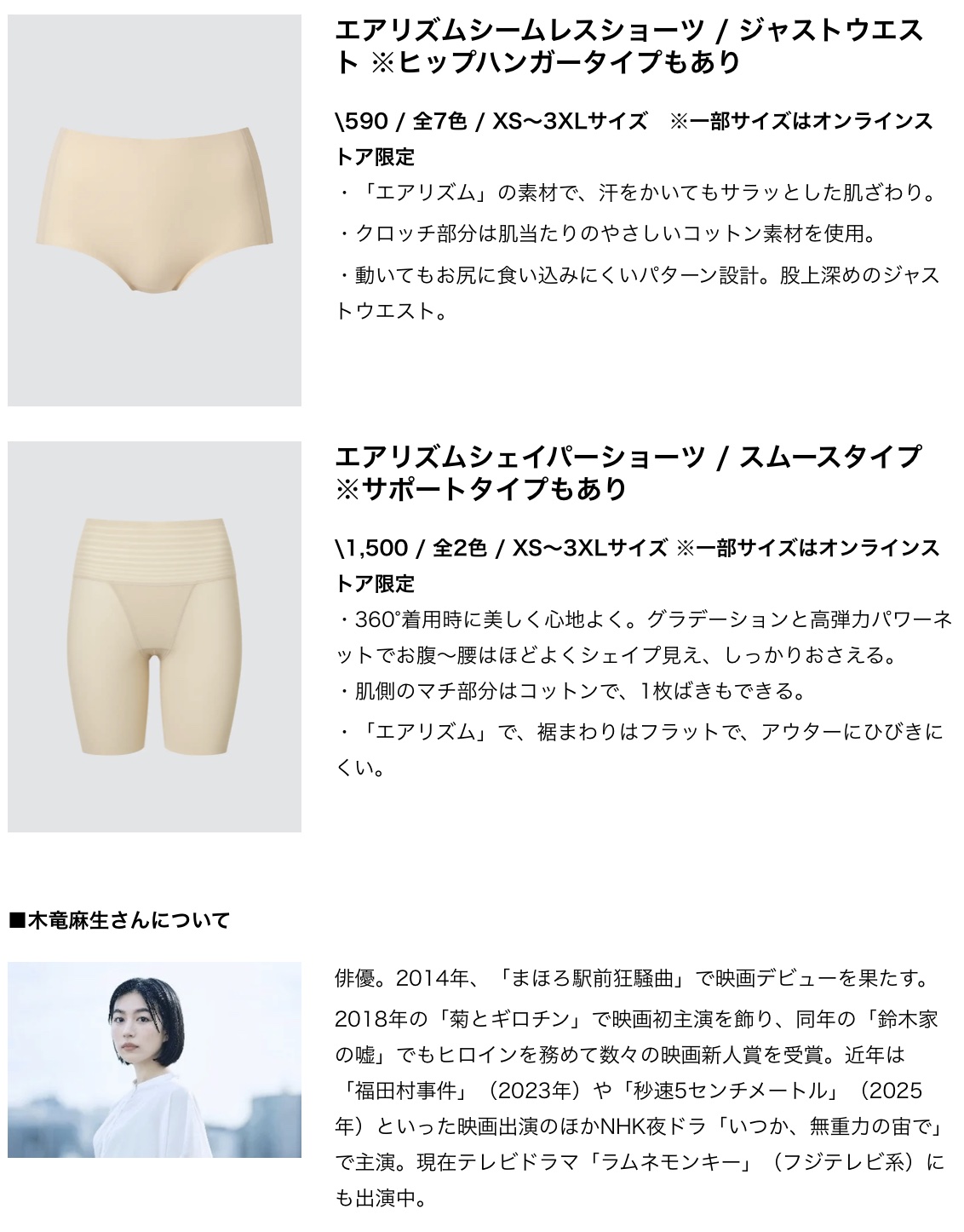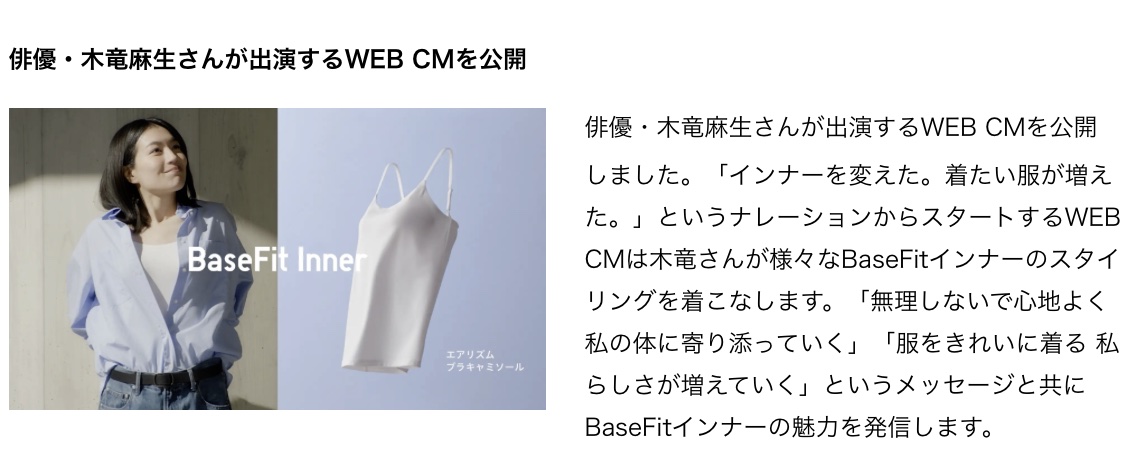 株式会社ユニクロ うつくしさを仕込む ユニクロの「BaseFit Inner(ベースフィット インナー)」ブラトップ、ブラ、ショーツなど機能性とキレイを両立したラインナップ 俳優・木竜麻生さんが出演するWEB CMも公開 (2026.2)