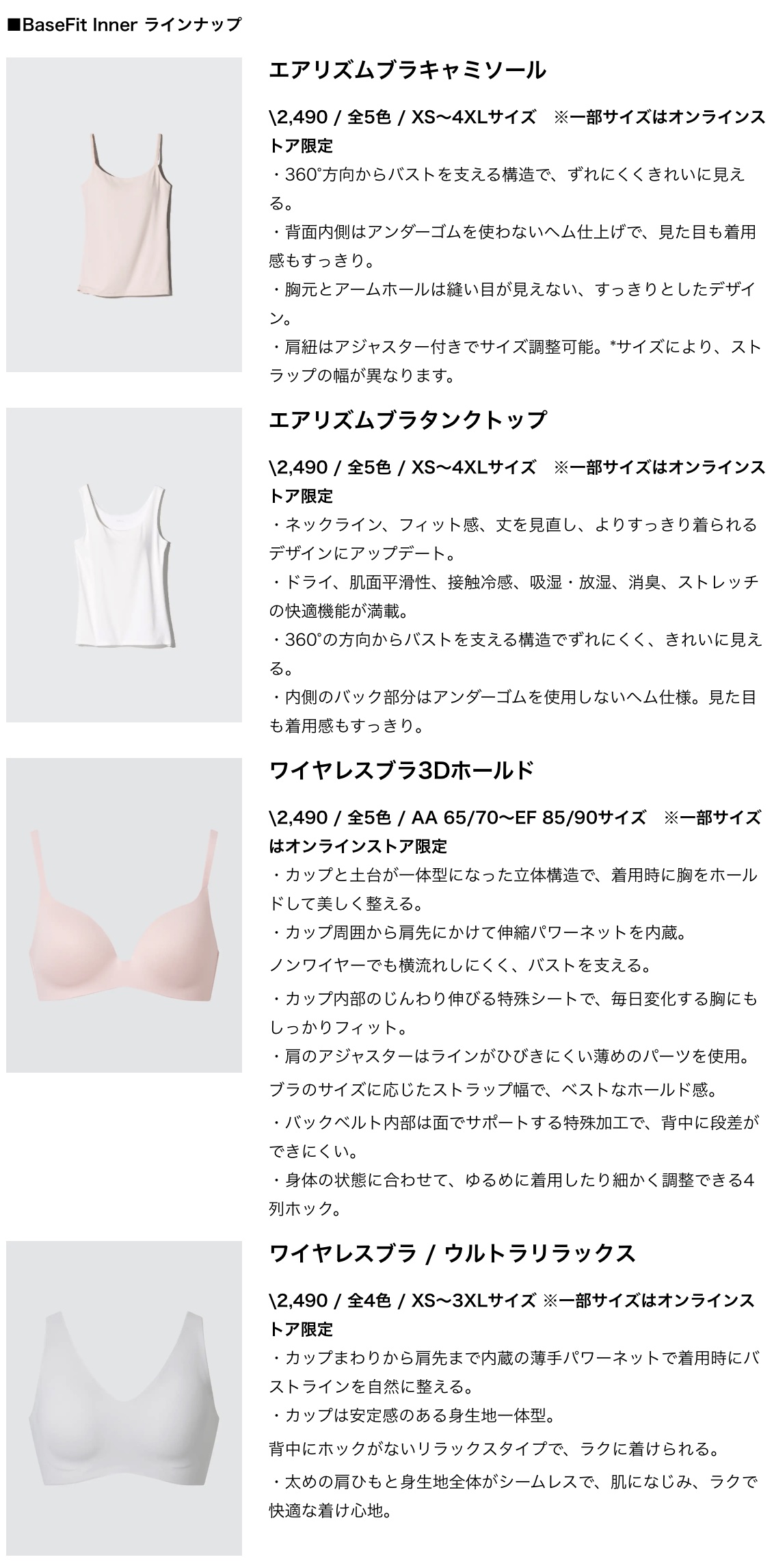 ユニクロは、うつくしい着こなしを支えるベースアイテムとして、ワイヤレスブラやシームレスショーツボディシェイパーなど、体に心地よくフィットしながら服にラインが響きにくいインナーを「Base Fit Inner(ベースフィット インナー)」としてご提案します。体のラインを無理なく整え、自分自身を自然にきれいに見せてくれる、機能性と見た目のうつくしさを両立するアイテムを厳選しました。あらゆる人の生活をより豊かにする服「LifeWear」をつくり続けてきたユニクロだからこそ実現できる、“服をうつくしく見せるためのインナー”という新しい考え方です。