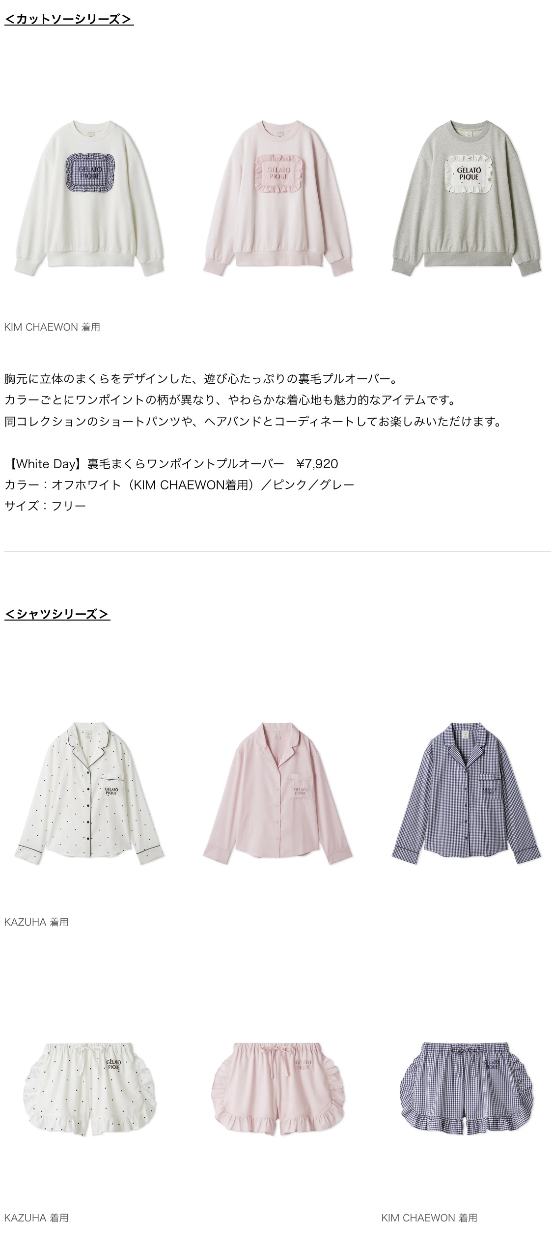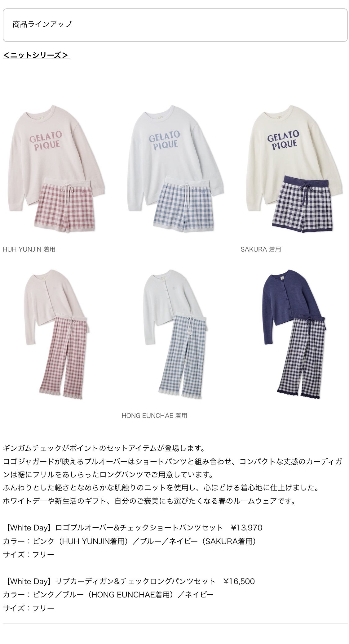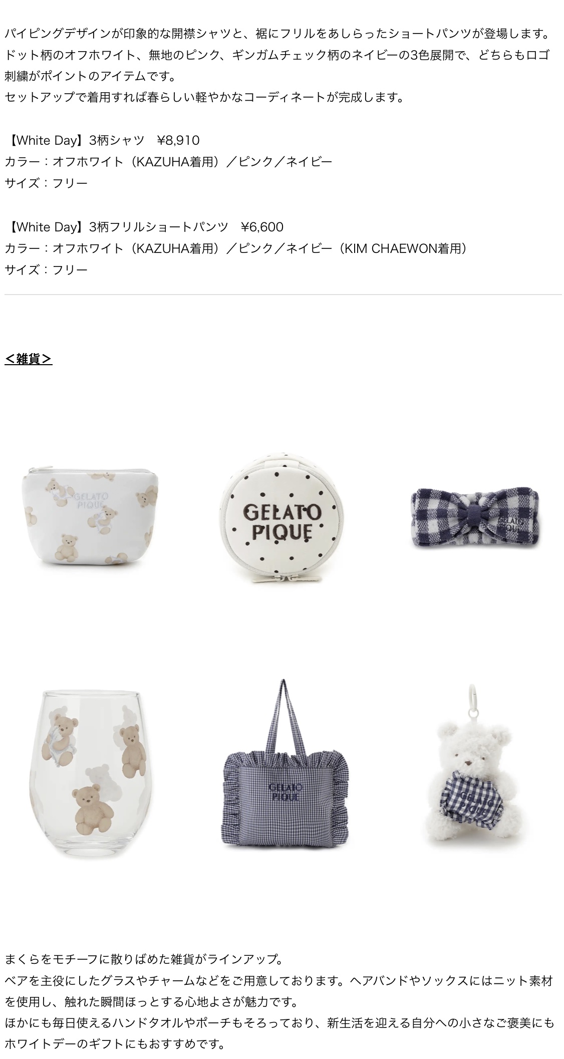 株式会社マッシュホールディングス 【gelato pique(ジェラート ピケ)】「LE SSERAFIM(ルセラフィム)」が着こなすギンガムチェックやドット柄、フリルにときめく新作「WHITE DAY COLLECTION 」を公開 <2月20日発売>ホワイトデーや新生活ギフトにも贈りたくなるまくらをモチーフにした遊び心あふれるコレクション。セットでも楽しめるルームウェアやベアが主役のアイテムも登場。 (2026.2)