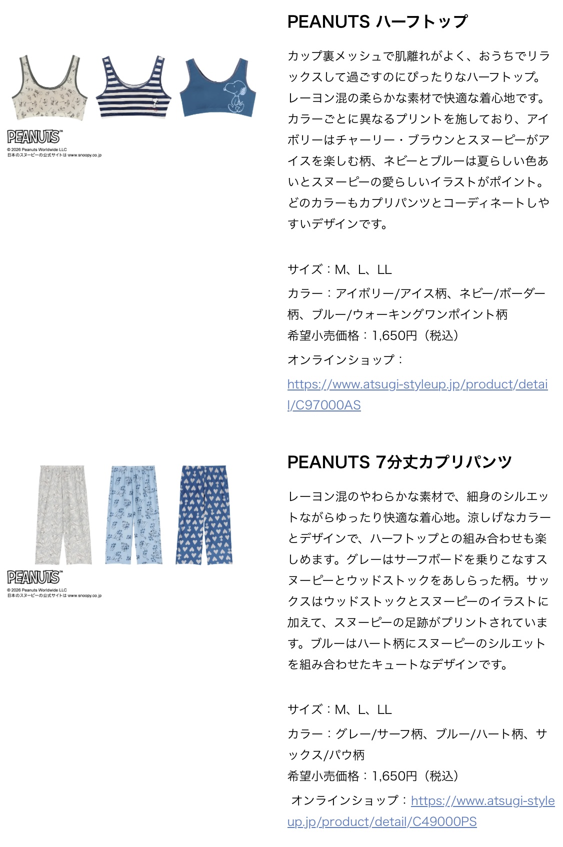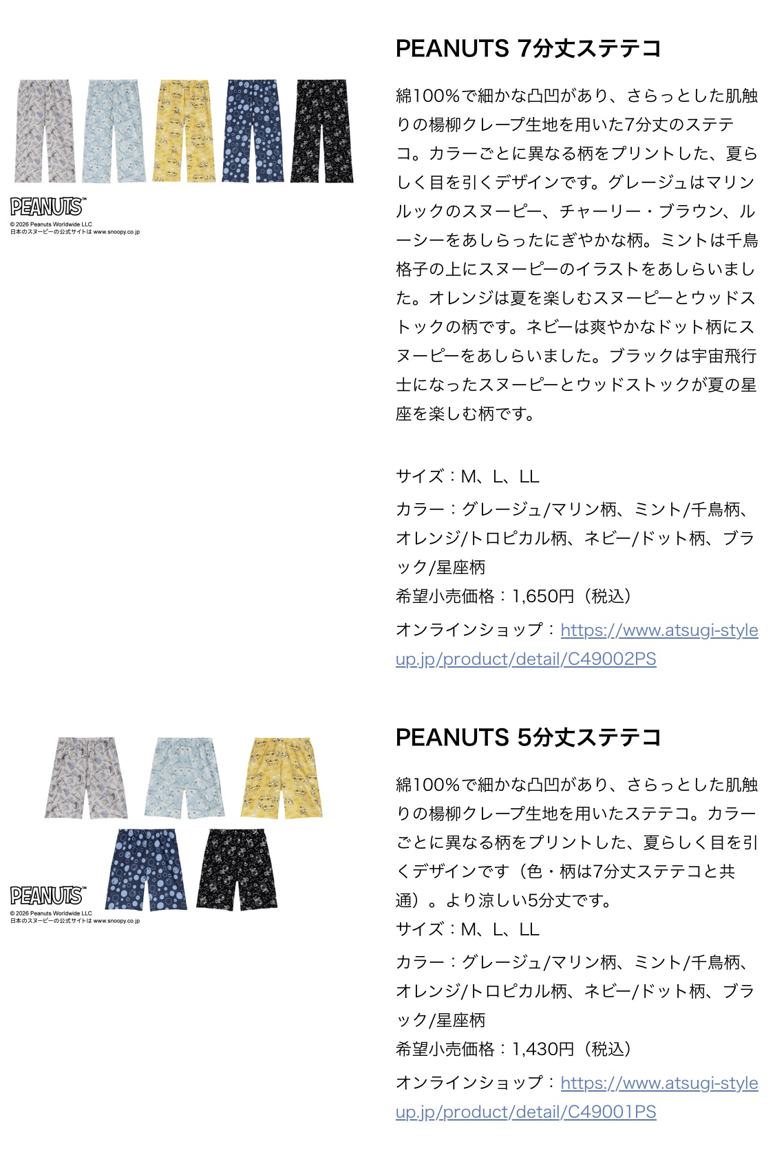 アツギ株式会社 暑い夏もおうちでリラックス スヌーピーをフィーチャーしたPEANUTSのハーフトップ、カプリパンツ、ステテコ新発売 (2026.2)