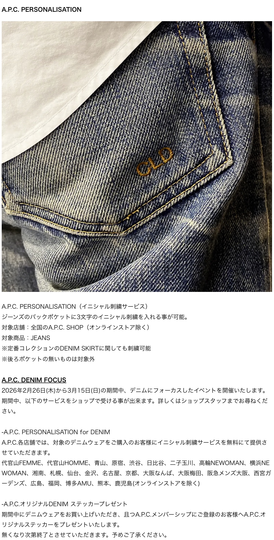 期間中は、バックポケットへのイニシャル刺繍サービスの無料提供、A.P.C. DENIMオリジナルステッカーのノベルティプレゼントなどを行います。