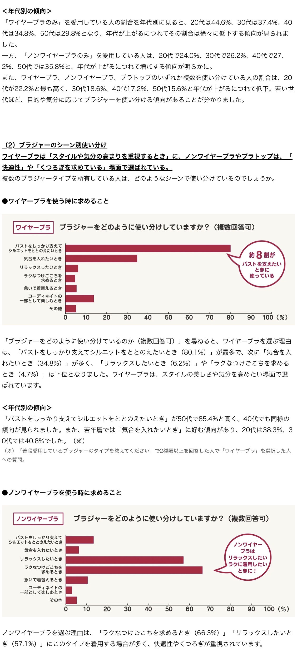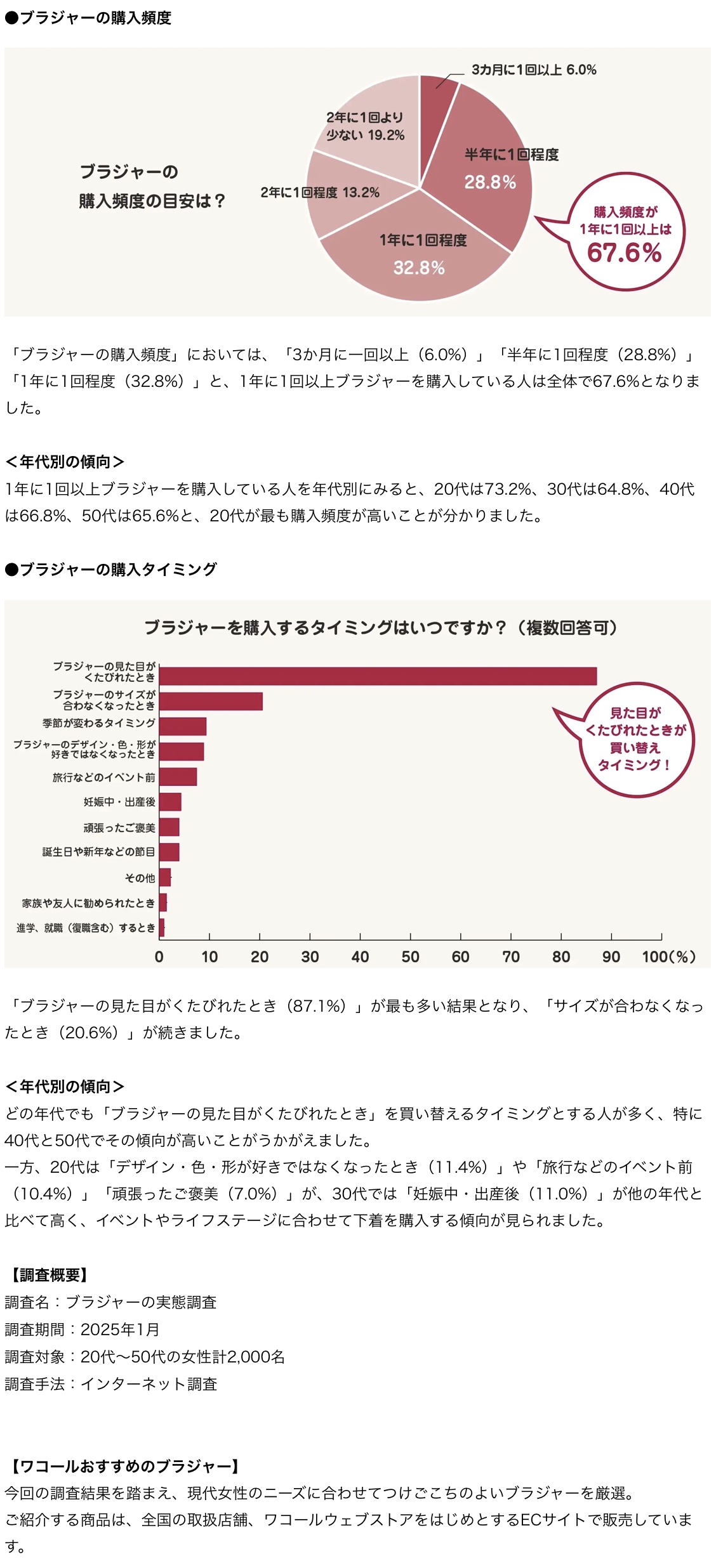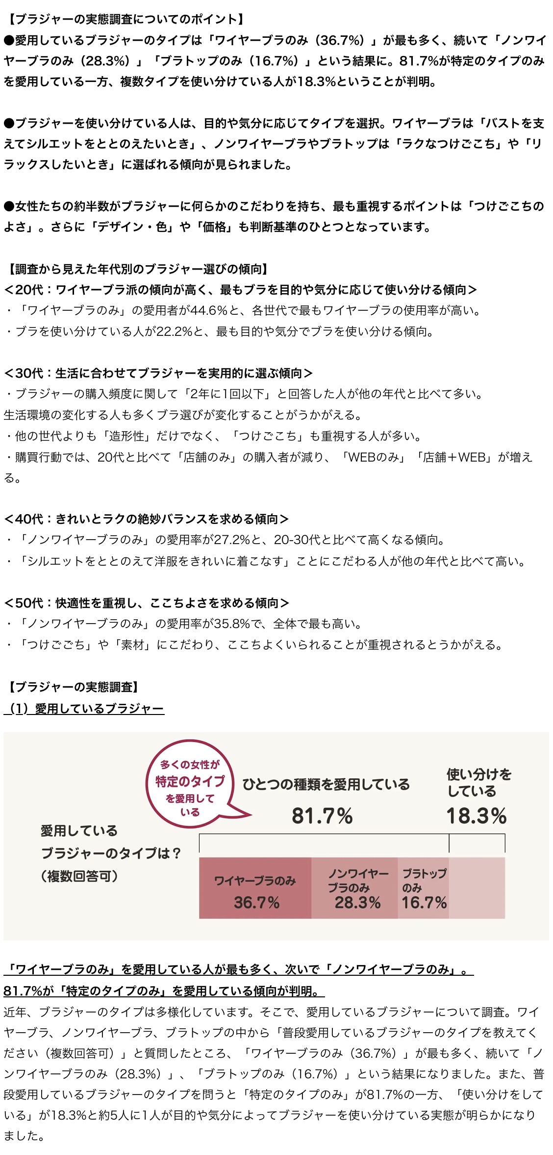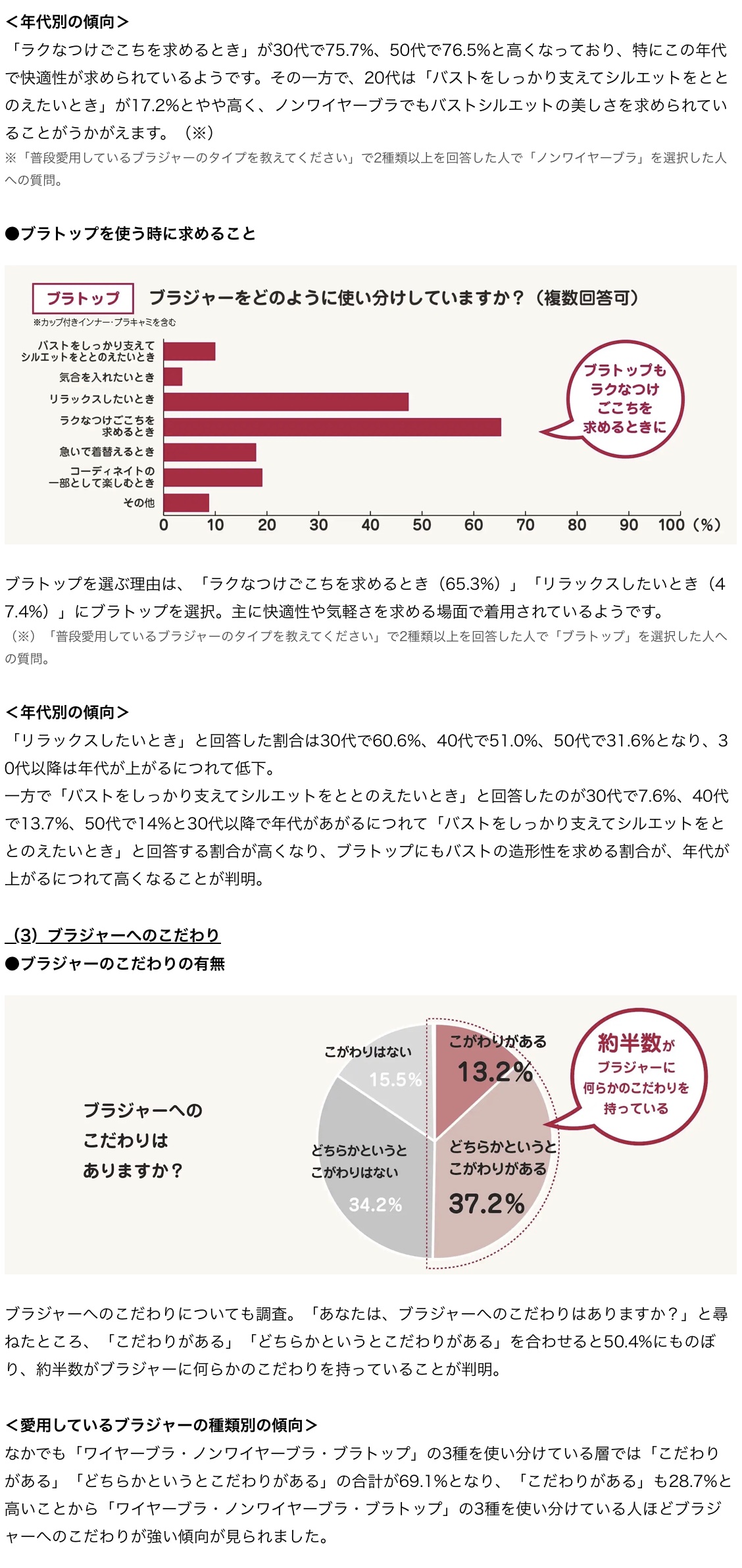 株式会社ワコール 「ブラジャーの日」に合わせて実施した2,000名調査で見えた“令和のブラ事情”「愛用しているブラジャータイプの実態」や「年代別での違い」の傾向も明らかに (2026.2)