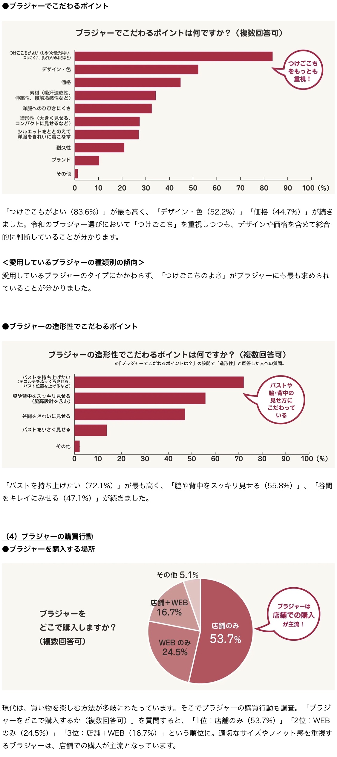 「ブラジャーでこだわるポイント(複数回答可)」では、「つけごこちのよさ(83.6%)」が最多でした。愛用するブラジャーの種類に関わらず、「つけごこち」が最も重視されており、ブラ選びにおいて重要な要素であることが分かりました。
