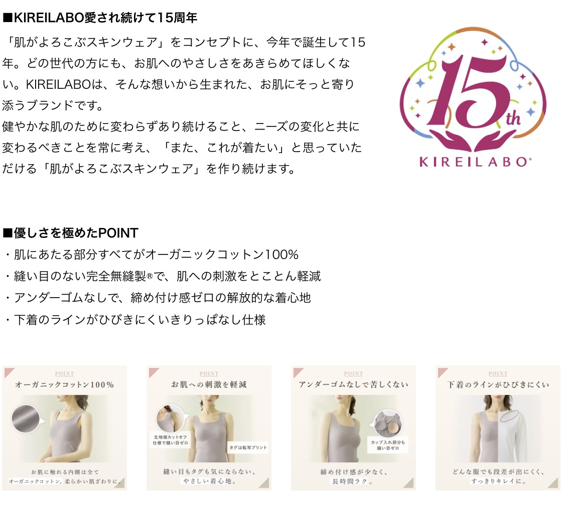 今年デビュー15周年を迎える「KIREILABO(キレイラボ)」は、長年肌への優しさを研究し、新たな製法で肌にあたる部分がオーガニックコットン100%で、外側には伸縮性のある素材を使用した生地を開発。通常の綿100%インナーにはないストレッチ性を確保しました。さらに、縫い目による刺激に対しても、縫い糸を一切使わない接着技術を活用した「完全無縫製®」で、肌への優しさを組み合わせた商品となっております。