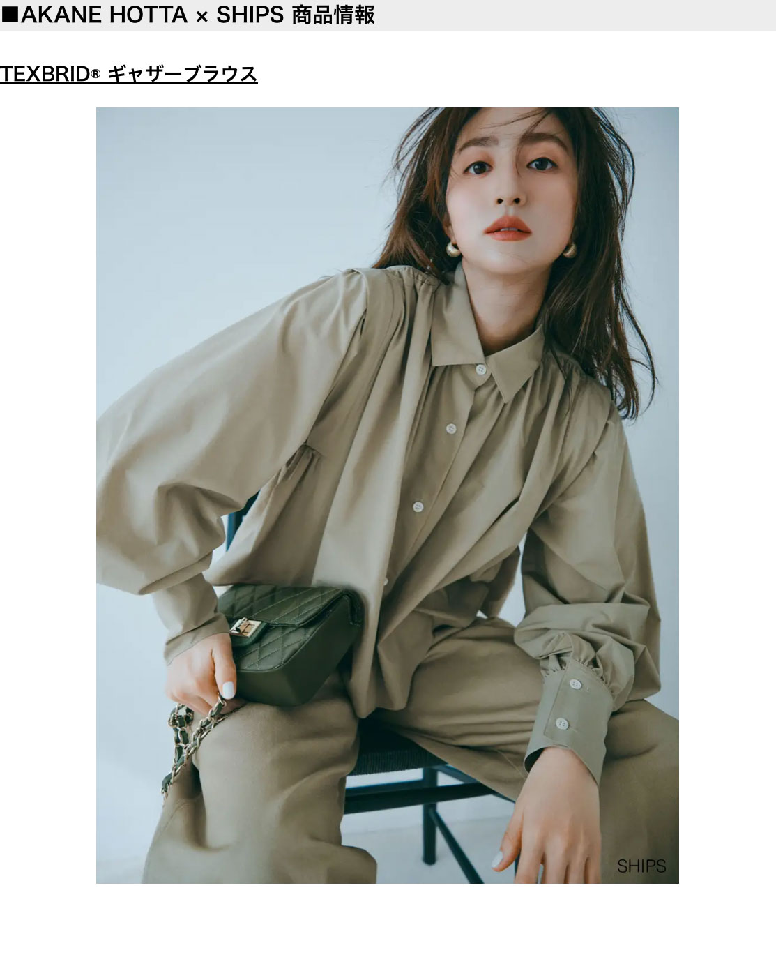 初となるSHIPSとのコラボレーションでは、「誰もが忙しく、余裕を持ちづらい日常の中でも、気を遣わずに自然体でいられる服」をテーマに、モデルとして多くの服を見てきた経験に加え、移動の多いライフスタイルを送る堀田茜さん自身の実感を反映し、見た目の美しさだけでなく、着用時のストレスの少なさや動きやすさ、扱いやすく日常にフィットする実用性にもこだわりました。
