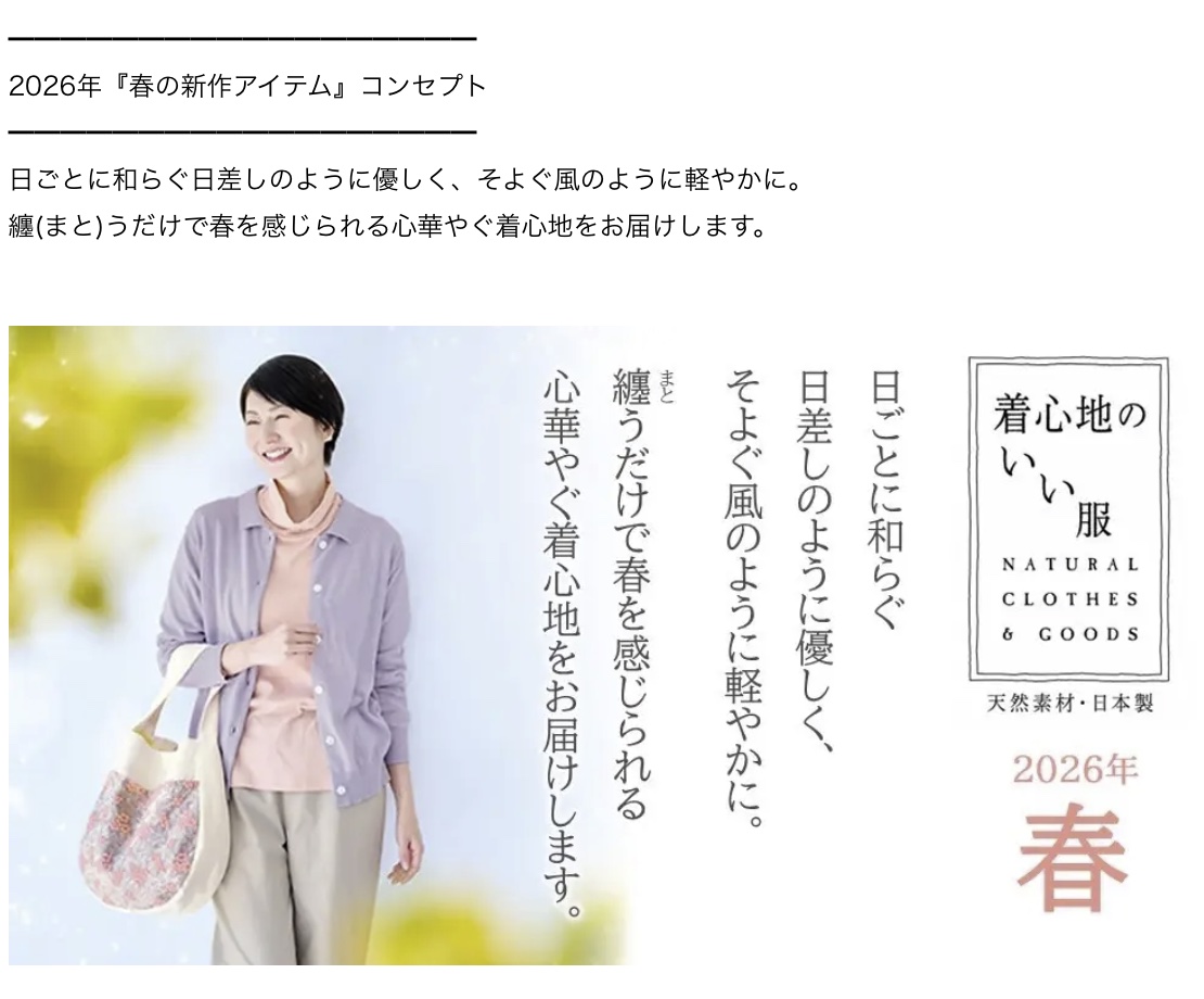 株式会社ユーキャン(東京都新宿区 代表取締役社長:品川 泰一)で展開する天然素材・日本製にこだわった「着心地のいい服」では、2026年『春の新作アイテム』の一般販売を公式サイトにて3月3日(火)に開始いたしました。