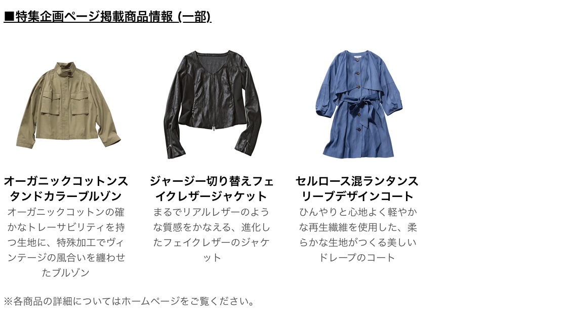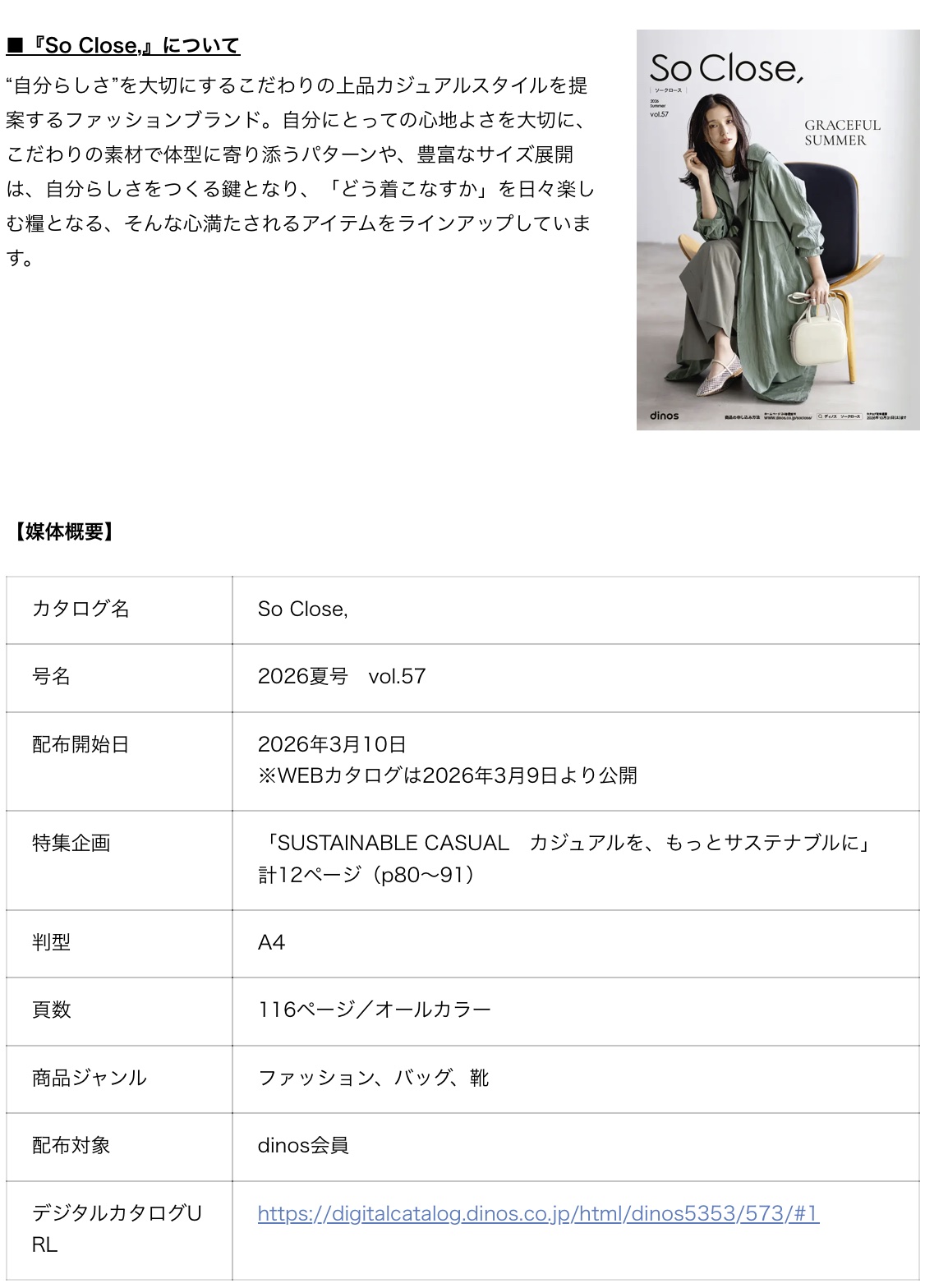 株式会社dinos(本社:東京都中野区、代表取締役社長:加藤 浩輔)は、“自分らしさ”を大切にするこだわりの上品カジュアルスタイルを提案するファッションブランド『So Close,(ソークロース,)』2026夏号において、サステナブルな素材を使ったアイテムの特集企画を掲載し、2026年3月10日に発刊します。また、ディノスオンラインショップにおいて特集企画ページに掲載している各商品を販売いたします。