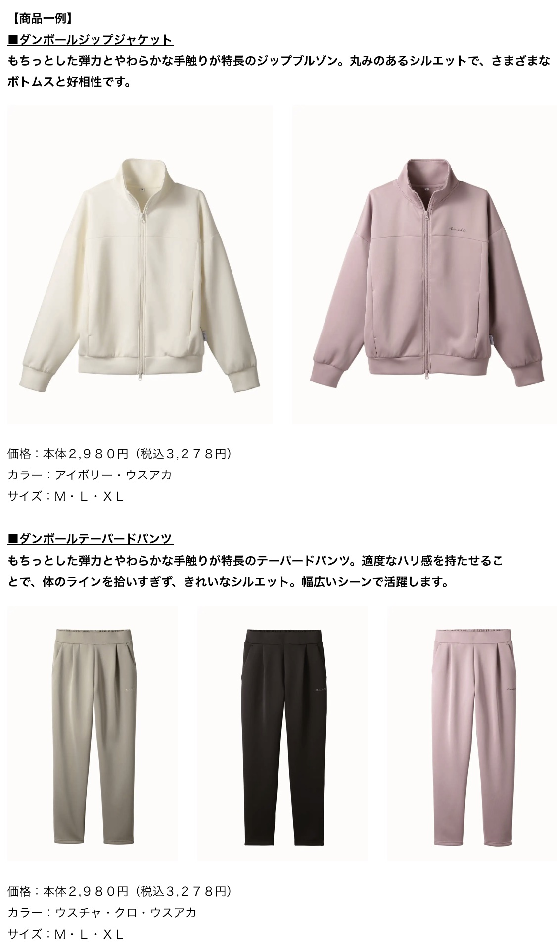 近年は、スウェット素材を外出着として楽しむ方が増えるなど、「リラックスしながら外にも出られる服」が人気を集めています。こうしたなか、当社では新ブランド「エネーブル」から、家でも外でもちょうどよく心地よく過ごせる服を販売します。