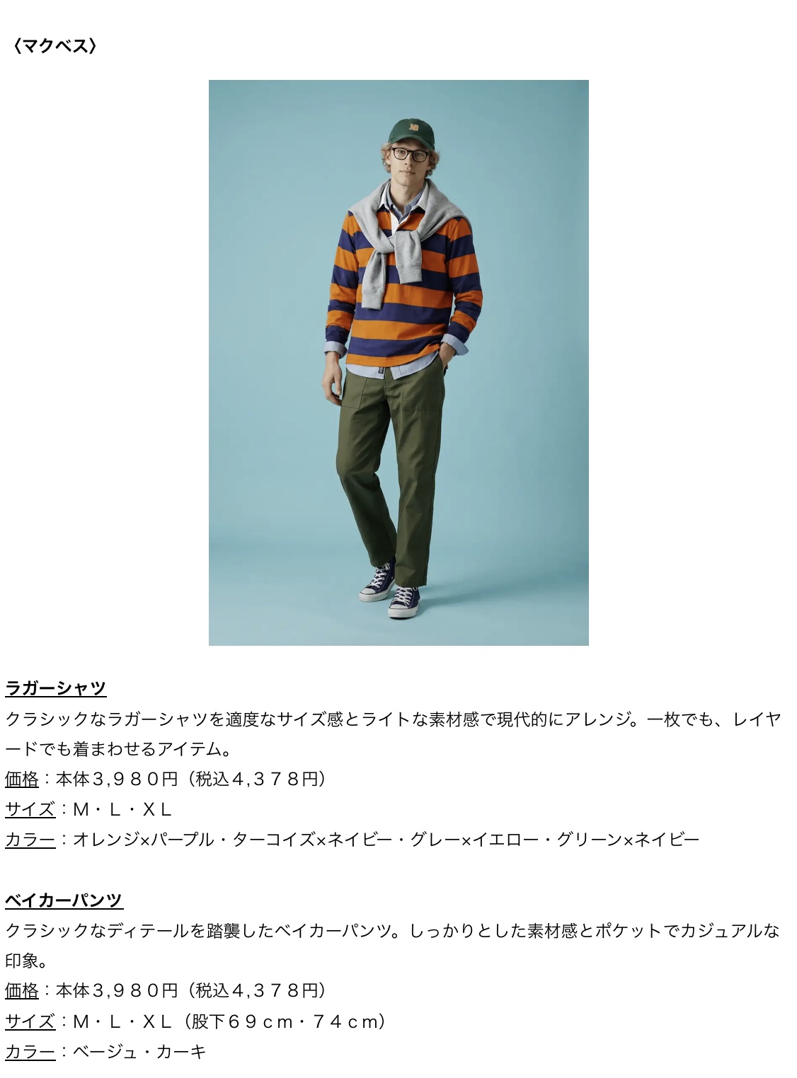 イオンリテールは3月13日(金)より、「イオン」「イオンスタイル」31店舗※1)と「イオンスタイルオンライン」にて、40代・50代男性向けの新カジュアルブランド「Melgraph.(以下、メルグラフ)」を展開します。合わせて既存のメンズカジュアルブランド「MACBETH(以下、マクベス)」も刷新し、40代・50代男性向けのカジュアルウエアを強化します。