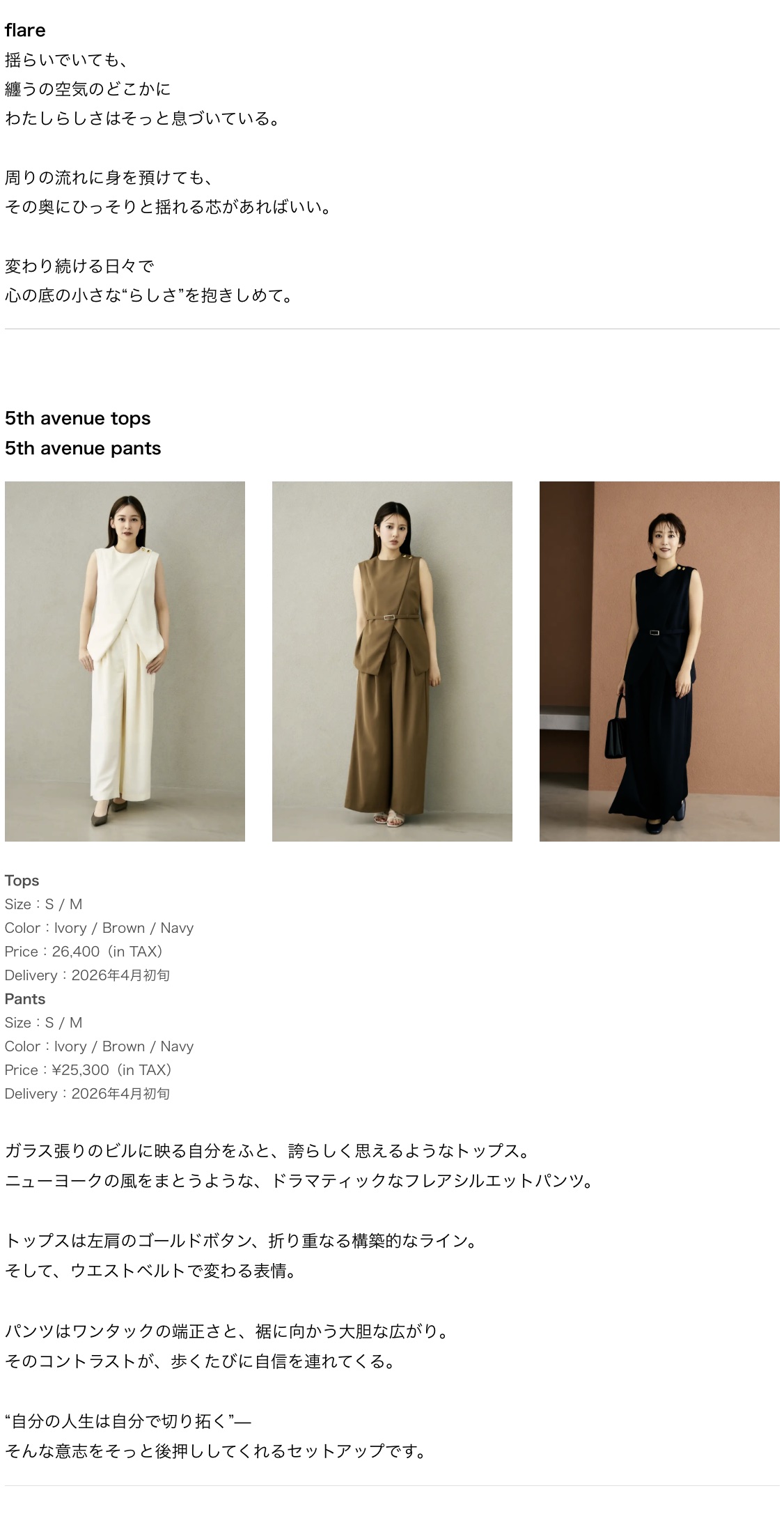 株式会社CEORY 日テレアナが運営するブランドAudire(アウディーレ)が、春夏新作5型を3/18に予約販売開始 環境や時代が変わり続ける日々の中でも”自分らしさ”をたしかに。そんなアイテムが並ぶ26SSコレクションflare。カジュアルシーンからフォーマルシーンまでマルチに着られる新作5型をお披露目。 (2026.3)