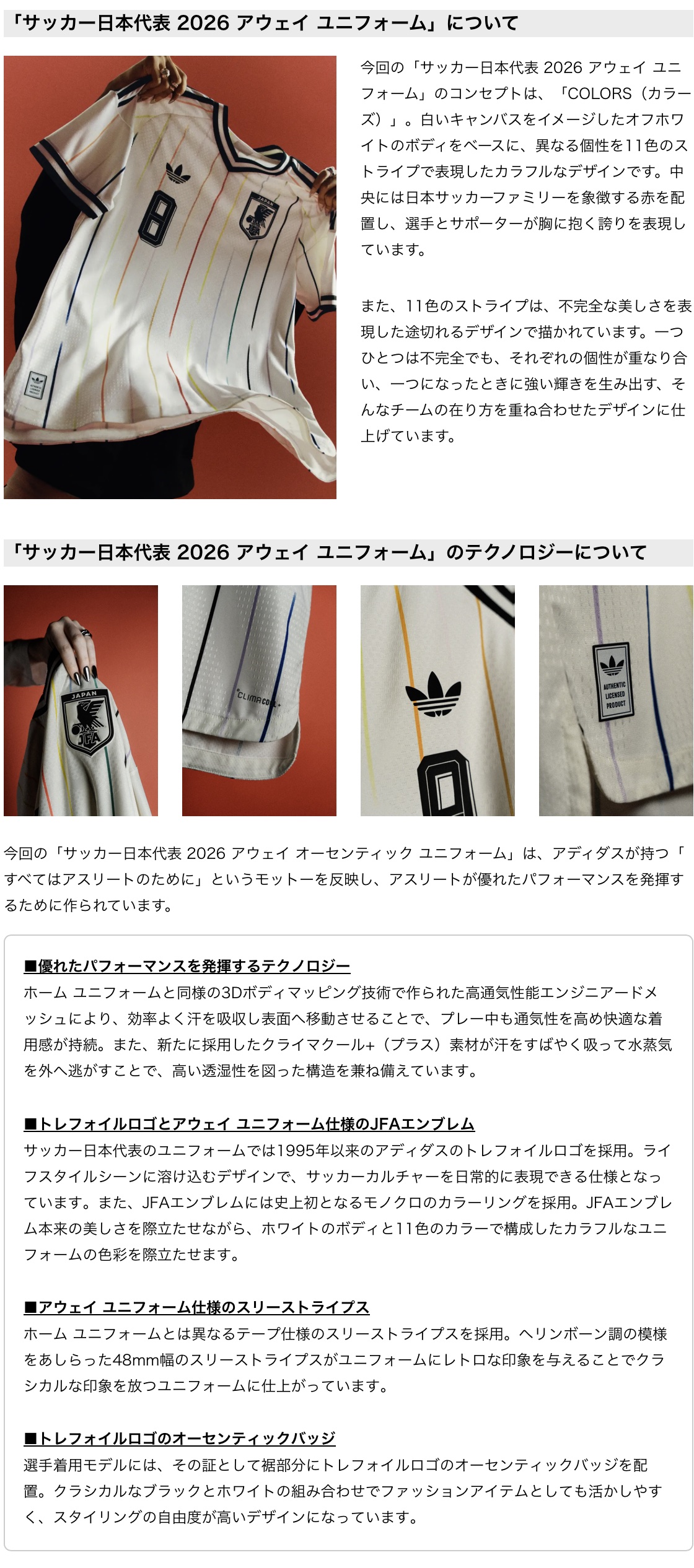 アディダス ジャパン株式会社(本社:東京都港区、代表取締役:萩尾孝平)は、「サッカー日本代表 2026 アウェイ ユニフォーム」を発表します。