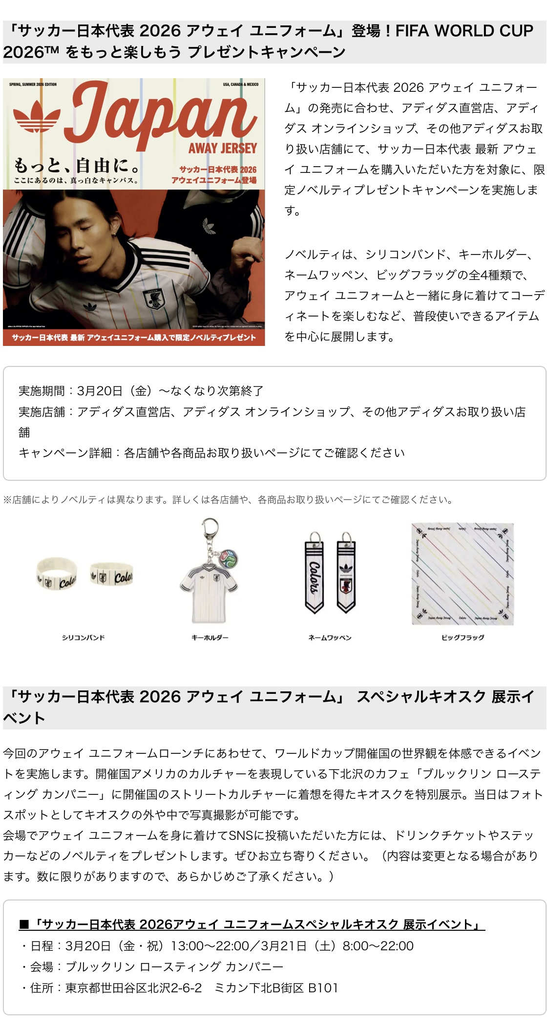 アディダスはサッカーカルチャーブランドとして、選手とファン一人ひとりの個性を解き放ち、サッカーの楽しみ方そのものを広げていく存在であり続けます。FIFAワールドカップ 2026の開幕を前に、「LIBRE」というテーマのもと、日本サッカーの未来と文化の発展に取り組んでいきます。 本コレクションは、3月20日(金)18時よりアディダス オンラインショップおよびアディダス アプリにて先行発売し、3月21日(土)より直営店ならびに全国のアディダス取扱店舗にて販売を開始します。