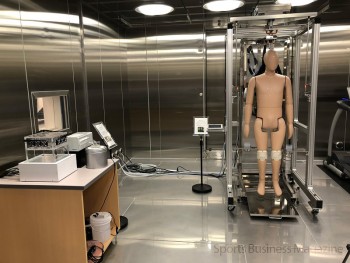 施設の中庭の一部を使った一周350メートルの試走路も設置した。100mの直線コースも併設しており、実際にランナーが試走して、着用するスポーツウエアの機能性を試験することができる。