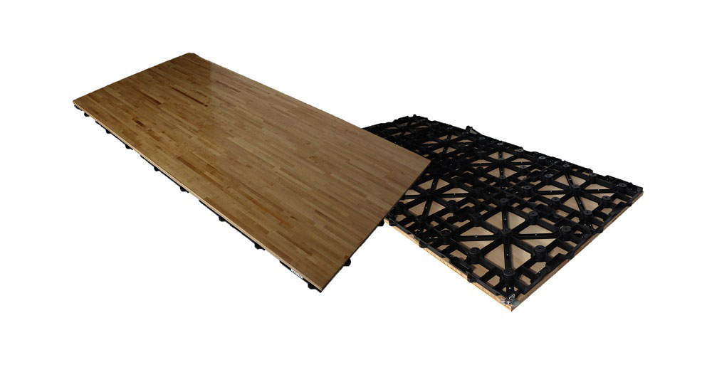開発の際、留意したのは「弾力性」「施工性」「安全性」の3点。常設の体育館の木製フロアの機能性や安全性を追求した。選手の意見も参考にしながら、滑りにくい塗料を採用するなどして、改善を続けた。「弾力性」では、選手の脚やひざなどにかかる負担を軽減するため、適切な“しなり”を追求した。「施工性」では、敷設しやすいよう強度と軽量性を両立した。グラスファイバーを加えた樹脂製の骨格で床を支える構造だ。「安全性」では、フロア同士の“つぎめ”部分を丸く加工。プレーする選手がけがをしないよう留意した。