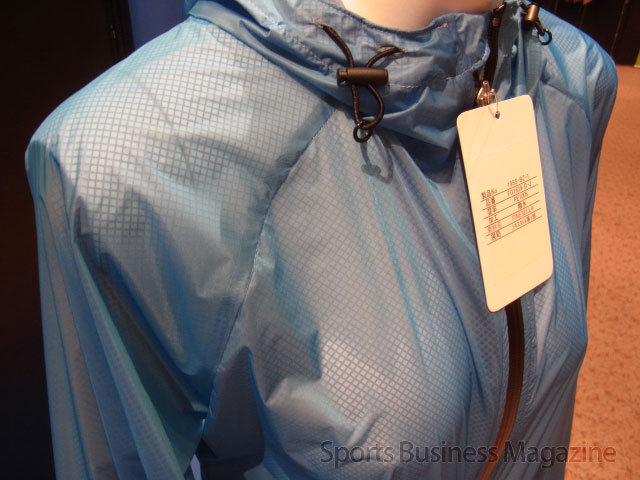 今回の展示会で、新たに提案した素材は、ニットラミネートの新素材「ファインセル®」。“生”のポリエステル素材を100%使用した生地で、特有の光沢感、風合いが特徴だ。スポーツやアウトドアシーンを想定した素材で、ニット素材に透湿フィルムを張り合わせている。