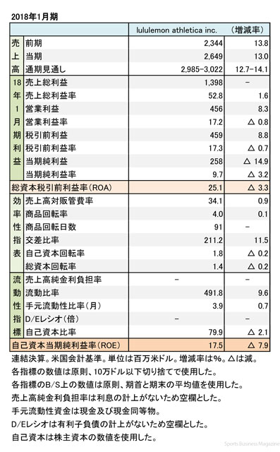 ヨガウエアやフィットネスウエアを手掛けるLululemon athletica inc.(ルルレモン社)の2018年1月期連結決算は、主力の米国、カナダのビジネスが好調で、増収・増益に至った。北米以外の地域も2ケタの増収を達成した。